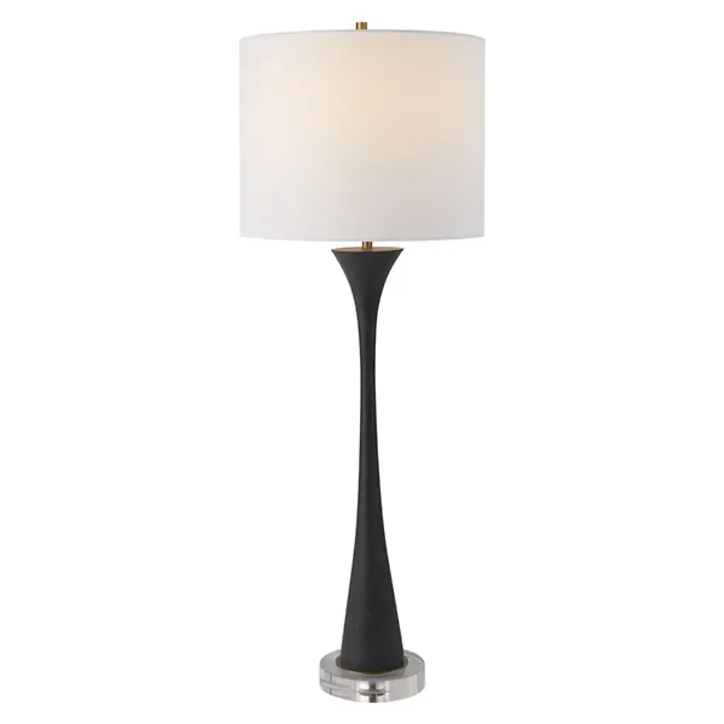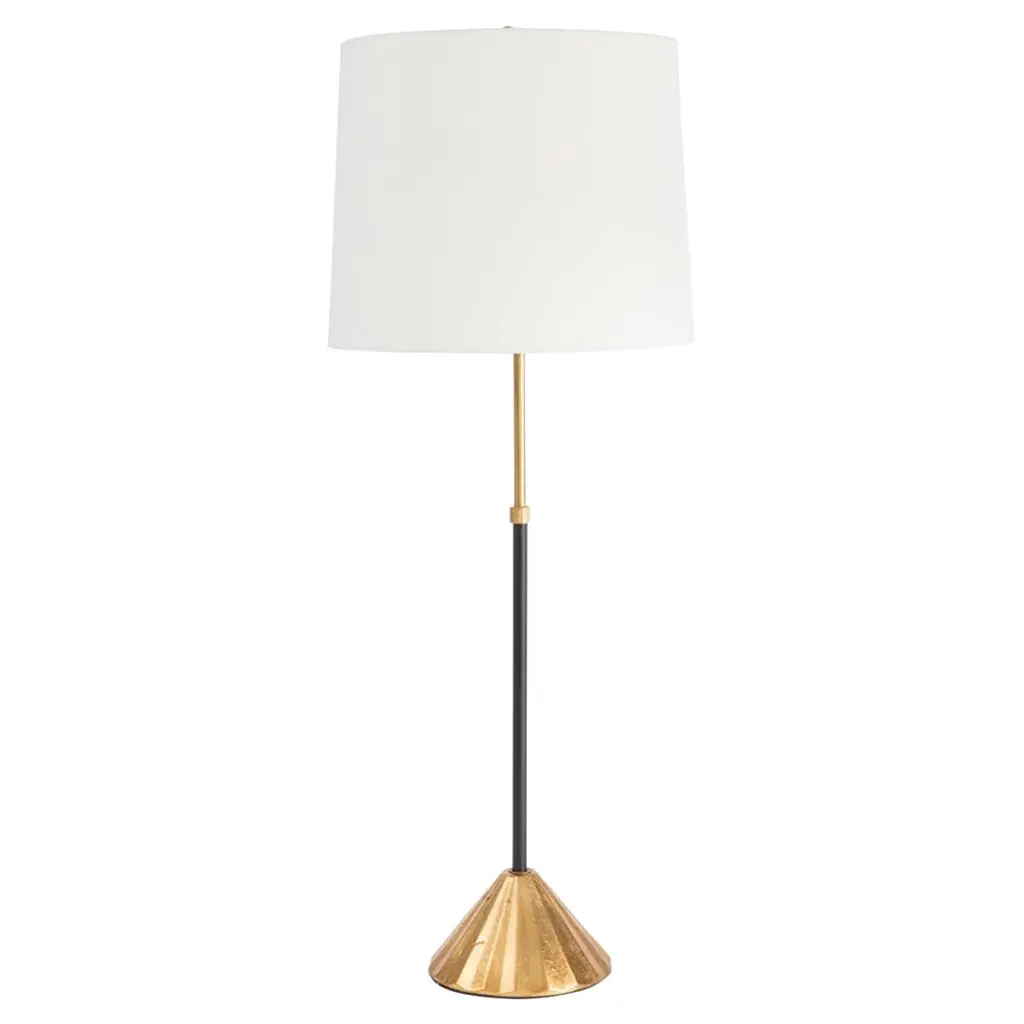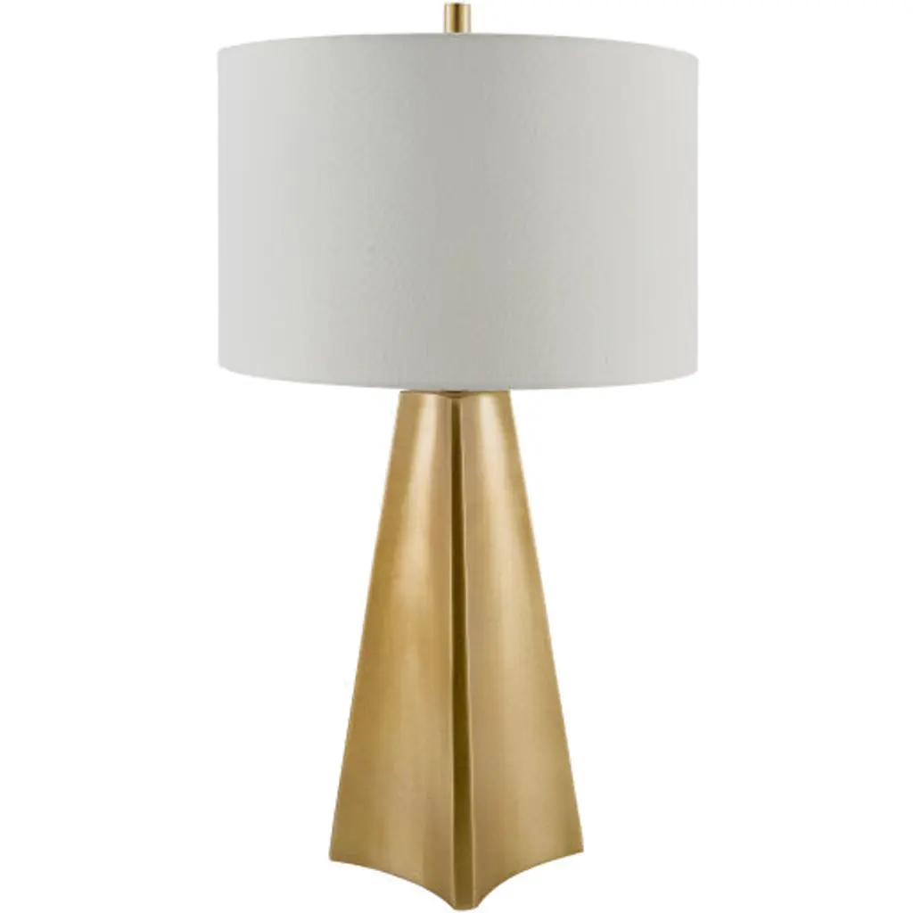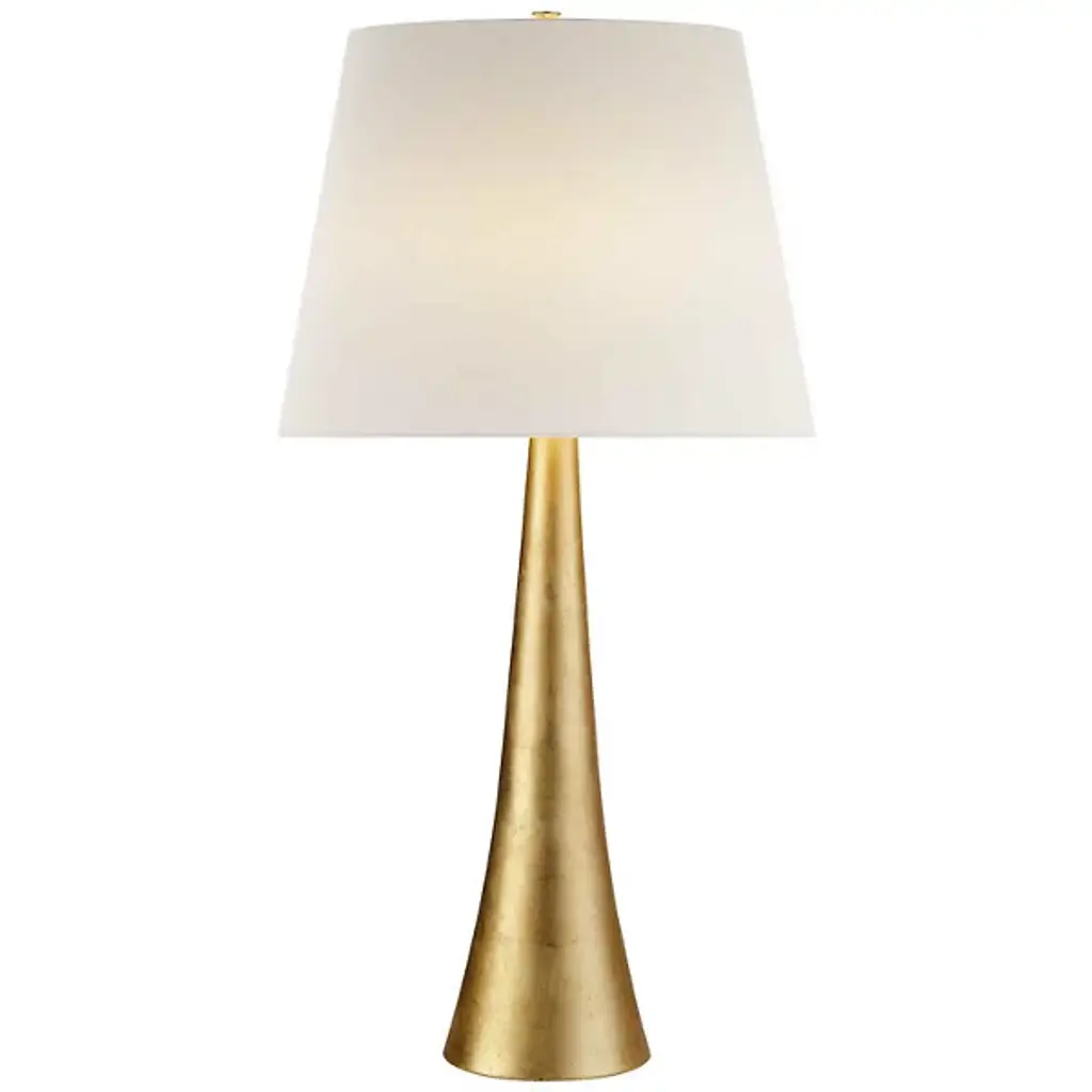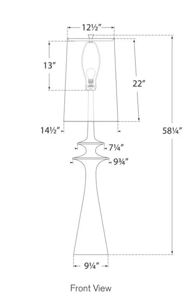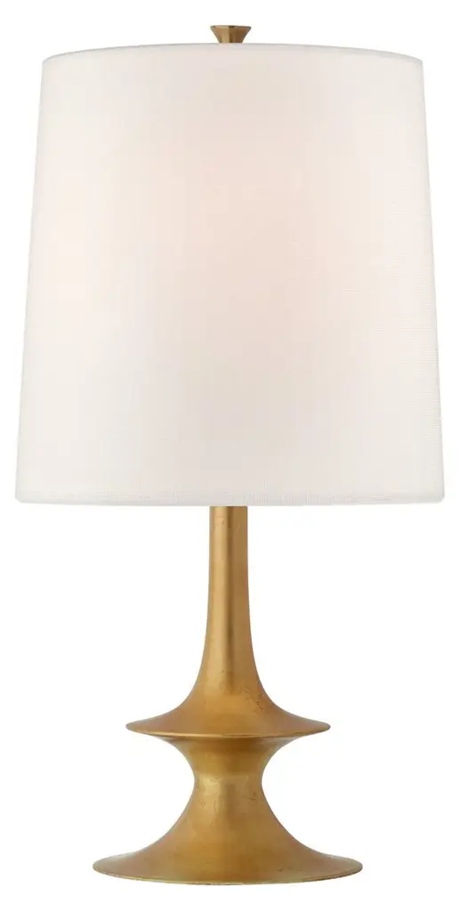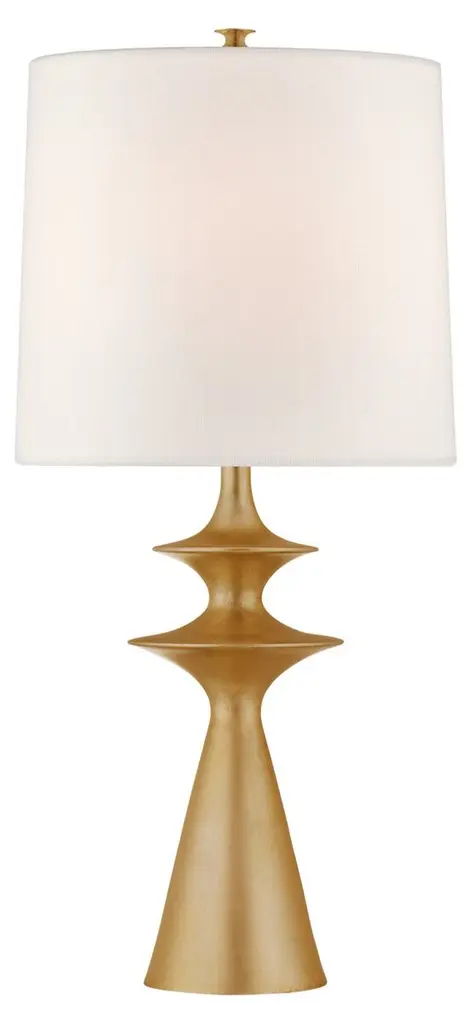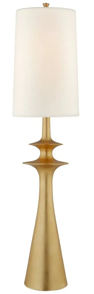 Lakmos Floor Lamp in Gild with Linen Shade Designer: AERIN Height: 58.25" Shade Detail: 12.5" x 14.5" x 22" Linen Base: 9.25" Round Socket: E26 Dimmer Wattage: 100 A19 Safety Rating Location: Dry