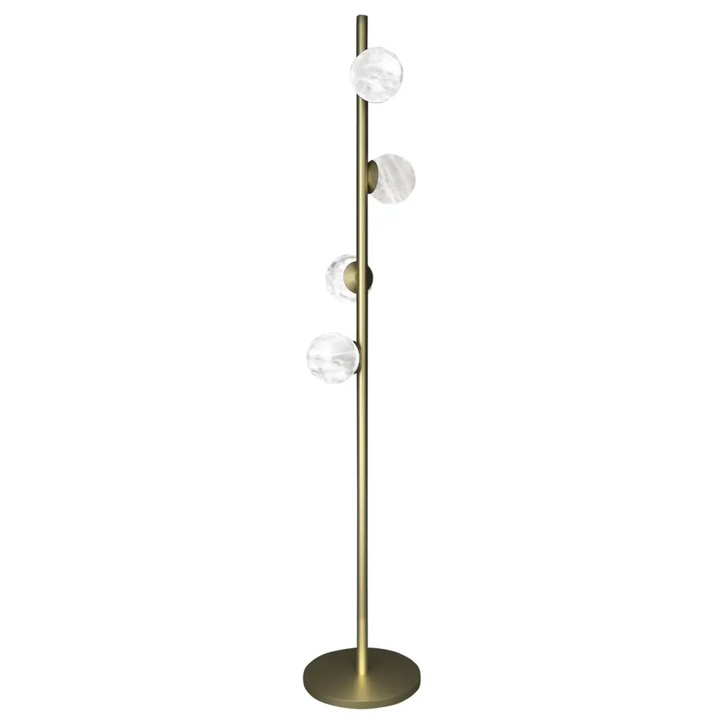 Named after the Greek goddess of love, this floor lamp fashioned of alabaster - regarded as the stone of gods - will infuse secret flair in any contemporary setting. A round base in Imperador marble sustains the cylindrical metal shaft finished in brushed, black nickel, to which are attached four multicolor Murano glass spheres marked by a twisted optic texture. Each sphere housing a G9 LED bulb is mounted on a thin alabaster disk turned by hand. Other colors are available, please ask the Concierge for details.
