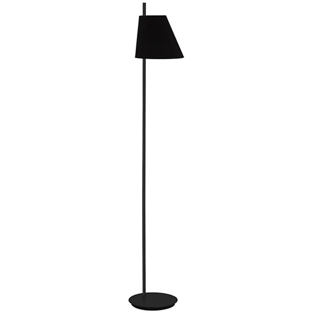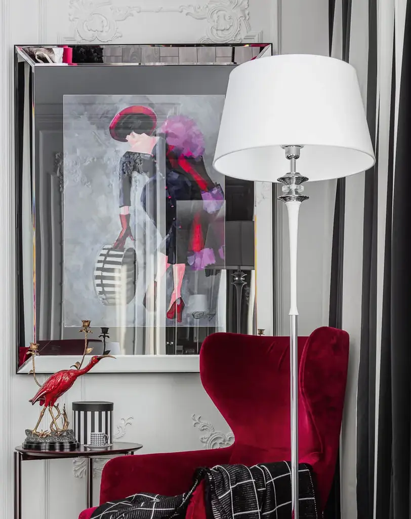 Agata is a floor lamp with white and chrome or black and chrome metal finish. Glass detail and white or black fabric shade.