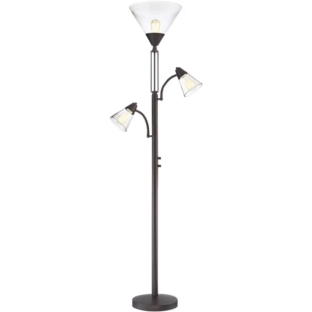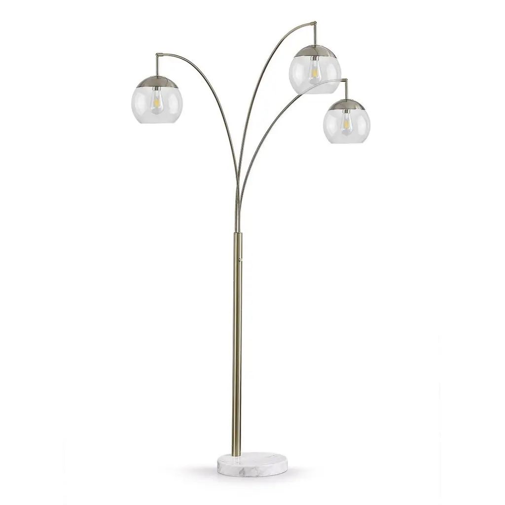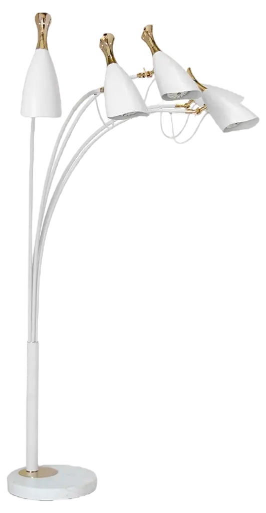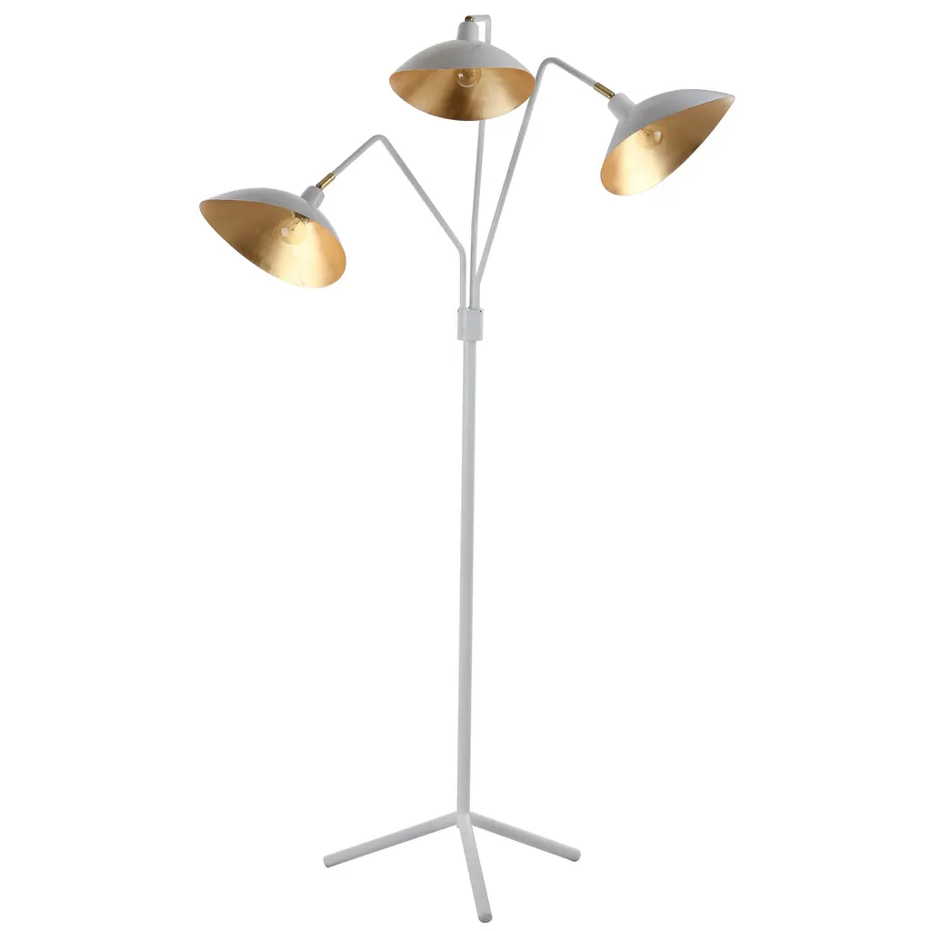 From the crisp white finish to the angled arms and curves of the gold-leaf-lined shades, this floor lamp is brimming with sophisticated, contemporary appeal.