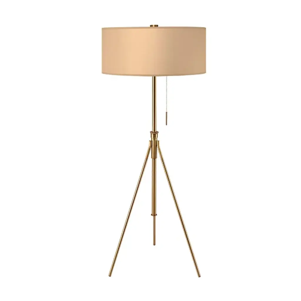 Trim and tidy. The Aiden Floor Lamp from Seascape Lamps lightens up the room, not only with its bulbs but with its clean silhouette. The floor lamp's refined design resonates in the modern space. It plants itself firmly to the ground with a tripod metal base. The height-adjustable base helps realize a spacious or more intimate glow. The sleek lines of the base point your eyes to the grand shade. Crafted from fabric, the drum shade serves as a time-honored element in the piece. Like an elegant earring, a fine pull chain hangs below. A tug on the pull chain creates a diffused glow that surrounds it like an aura.