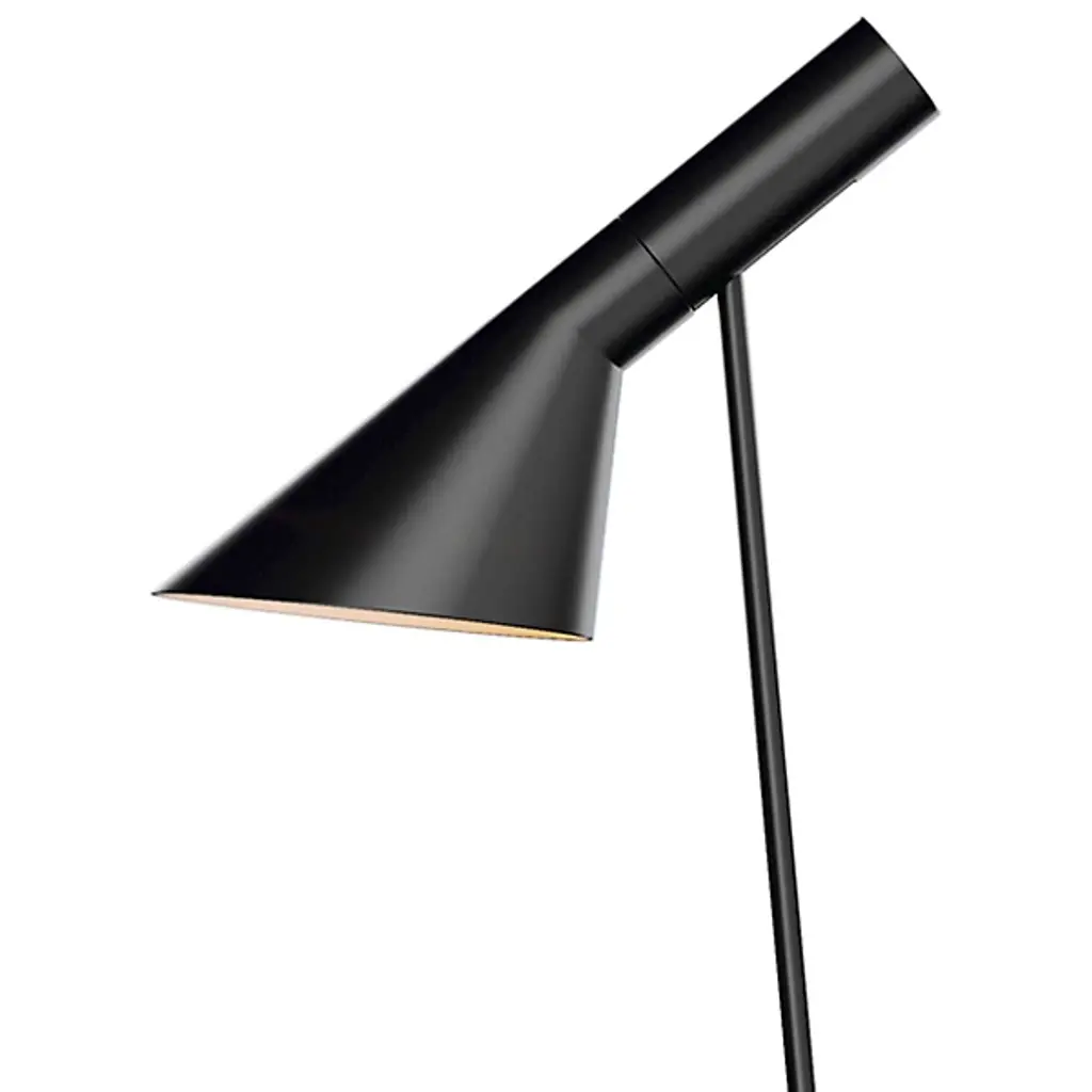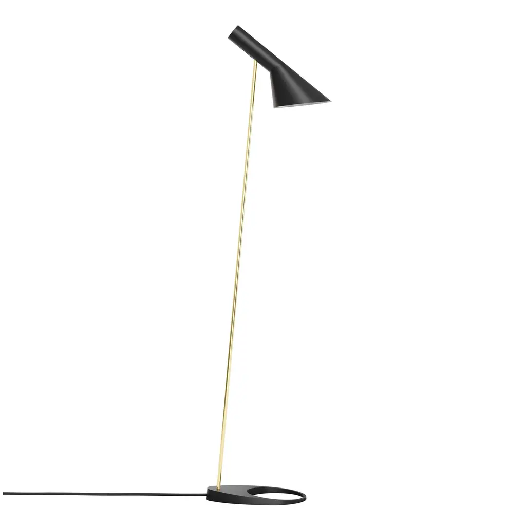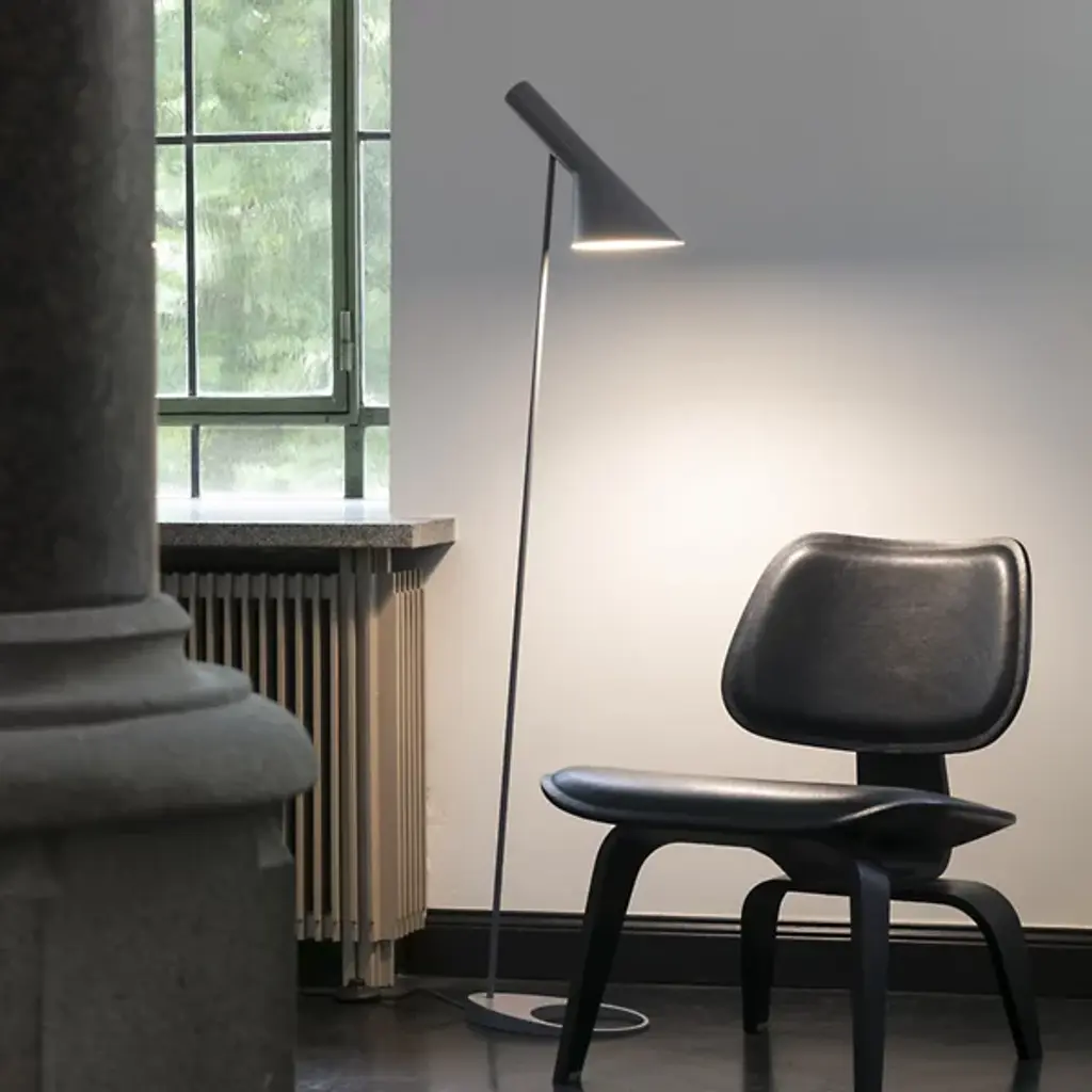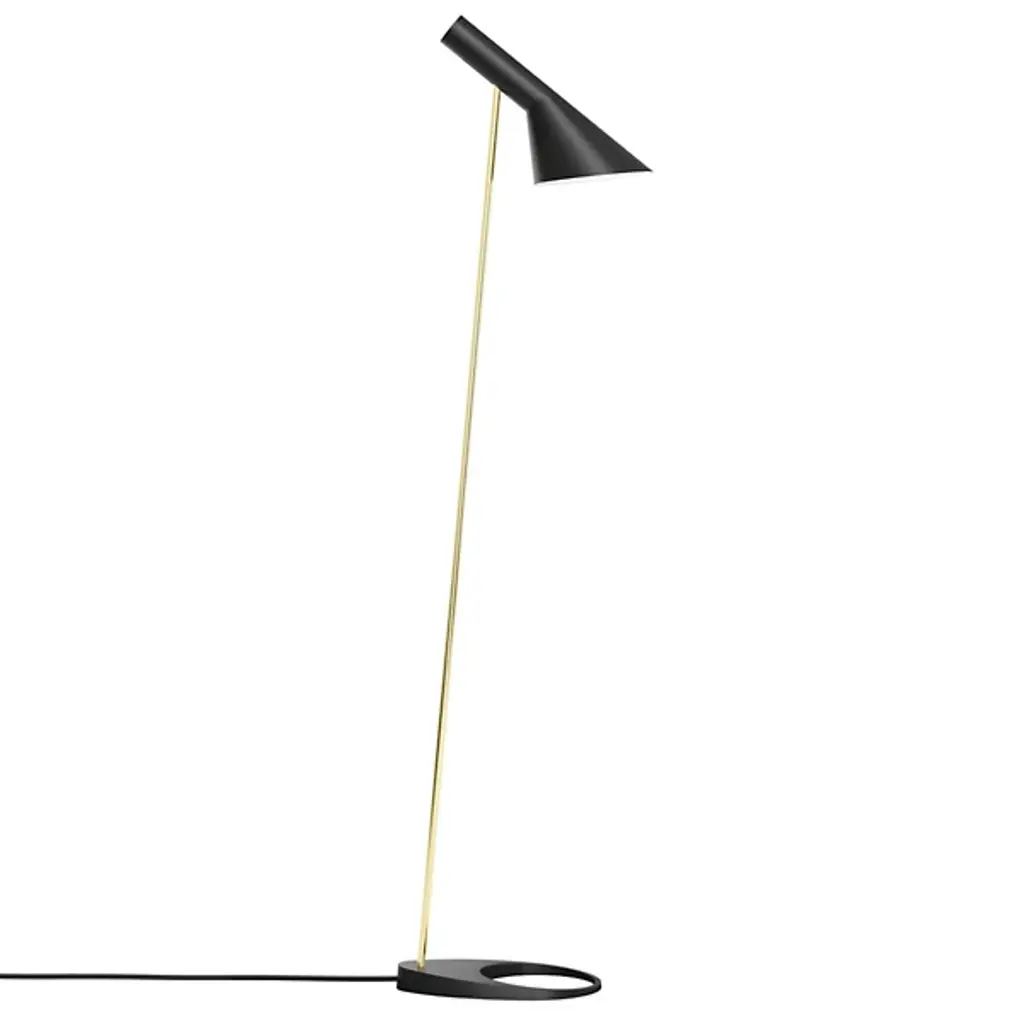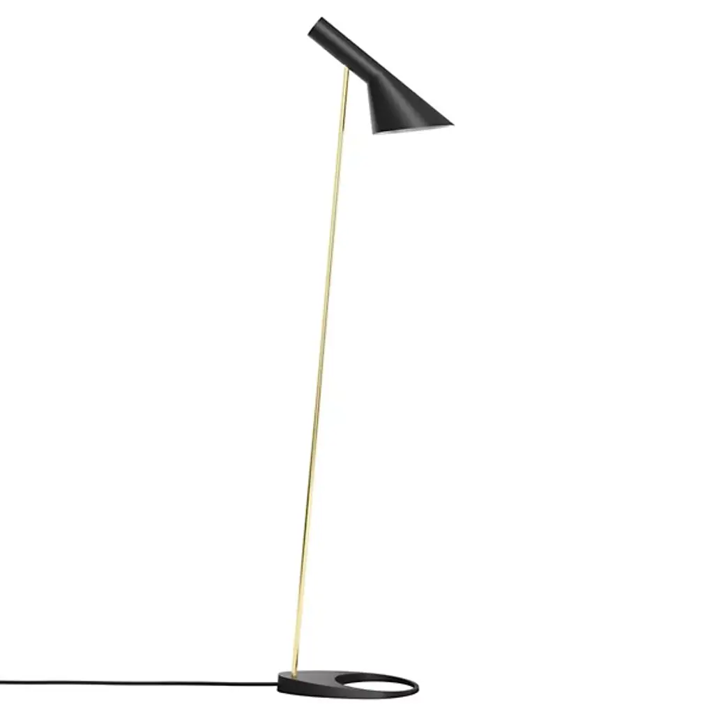 Designed for the SAS Royal Hotel in Copenhagen, Denmark, the AJ Floor Lamp from Louis Poulsen modern classic features an asymmetrical shape and tiltable head. The sleek, understated design ensures this floor lamp can complement many different established motifs. This modern light emits downward directed light. The angle of the shade can be adjusted to optimize light distribution, and the shade is painted white on the inside to ensure a soft, comfortable light.