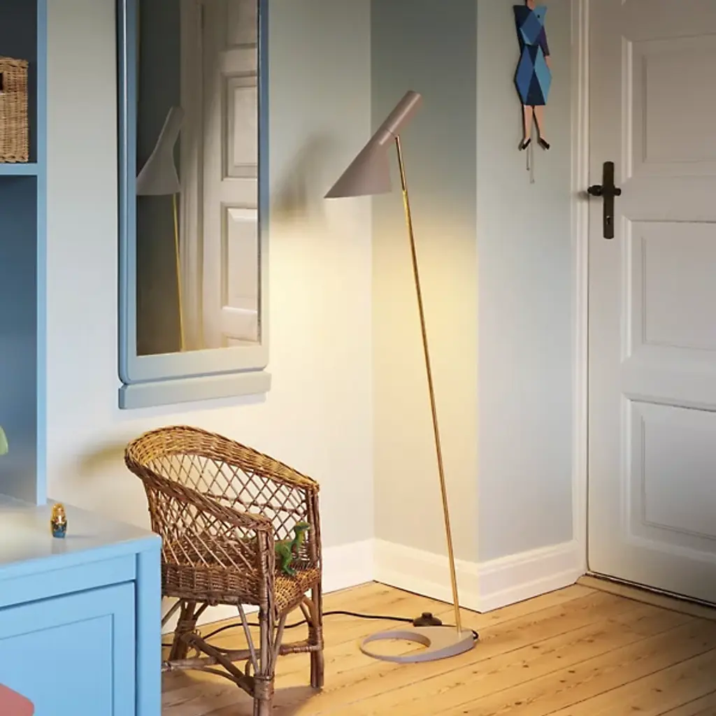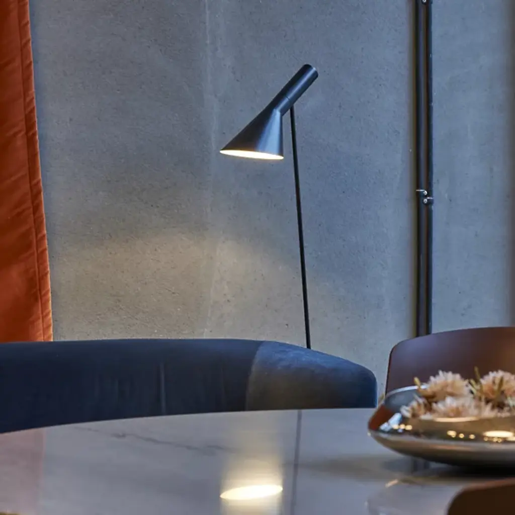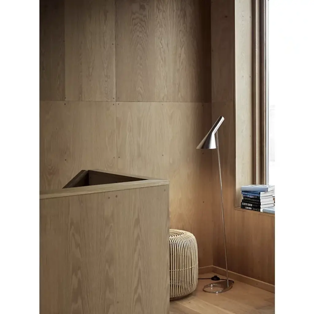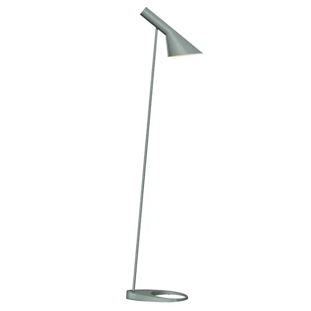 Designed for the SAS Royal Hotel in Copenhagen, Denmark, the AJ Floor Lamp from Louis Poulsen modern classic features an asymmetrical shape and tiltable head. The sleek, understated design ensures this floor lamp can complement many different established motifs. This modern light emits downward directed light. The angle of the shade can be adjusted to optimize light distribution, and the shade is painted white on the inside to ensure a soft, comfortable light.