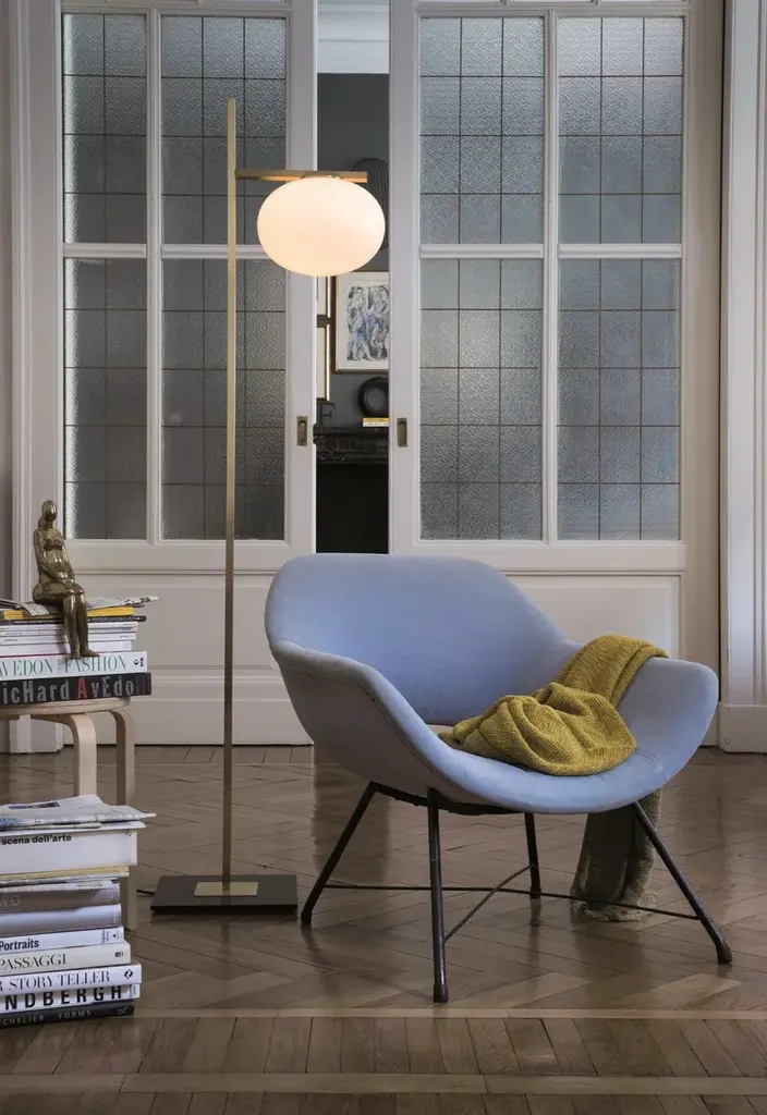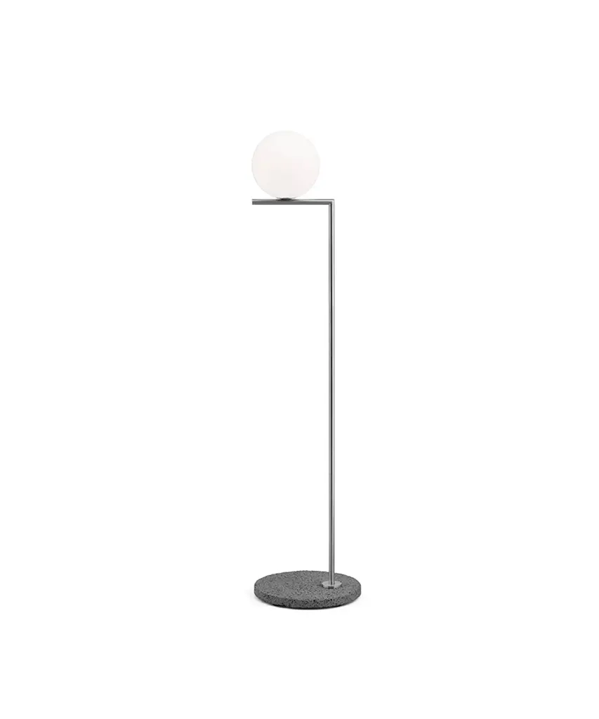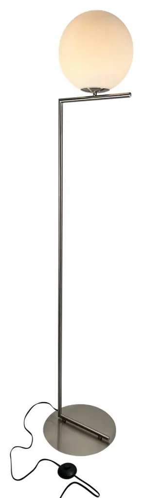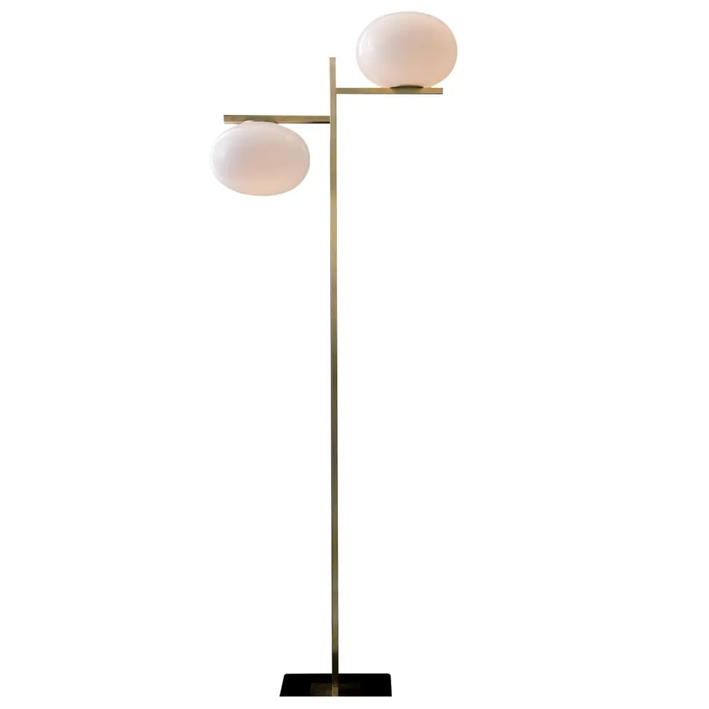 Brass and glass floor lamp with dimmer.1 x max 60 W E27 (halo)1 x max 25 W E27 (LED)↑ 160 cm Materials: metal / blown-glassColors: satin brass / polished opalineCertifications: CEThe concept of Alba starts with a very simple element: the designer’s imagination was inspired by a drop of water – which she puts to use in different ways, depending on the model. References to the world of nature, with soft shapes contrasted with square lines, together with the use of a satin brass finish, combine to create Alba, a family with a strong visual impact.