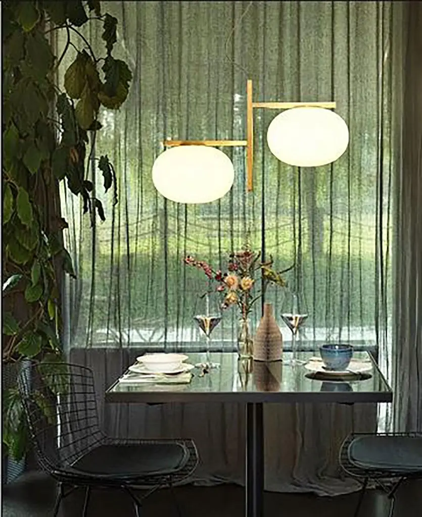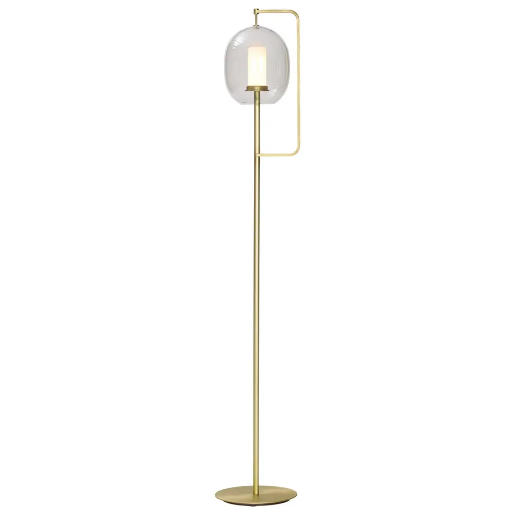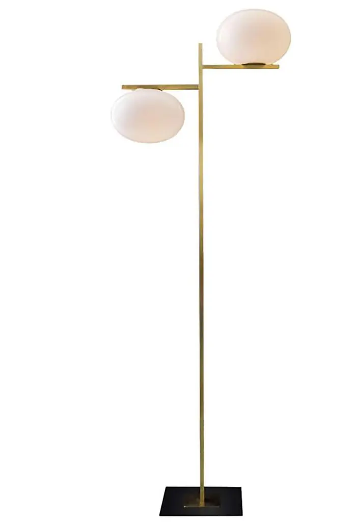 Alba floor lamp designed by Mariana Pellegrino Soto for Oluce. The shape of the lamp is reminiscent of a drop of water and the world of nature. This lamp is available in two-floor versions, one arm or two arms. In both floor versions, there is a large rectangular stem section that is made of satin brass, ensuring stability. The base is made of Anthracite. In the two-arm version, two arms are available at different heights that support the spheres. A black universal dimmer is included. The lamp can take up to 60 W Medium base bulbs. The shade material is in white polished opal glass.Dimensions:28.5 W x 28.5 D x 161 HAvailable as shown: One arm: Gold, Anodic Bronze: $1,640Also available as Two arms: Gold, Anodic Bronze: $2,230.