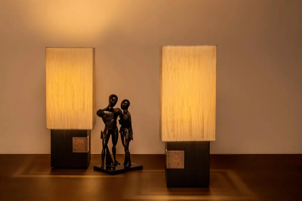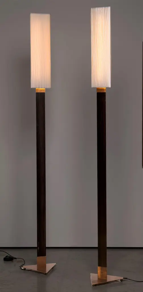 Aldebaran Floor Lamp by Arch Plus UltraDimensions: W 36 x D 31 x H 220 cm.Materials: Macassar Wood, Patinated bronze, Silk jacquard.Also available in Table lamp. Aldebaran, the brightest star of Taurus, has given inspiration for a strong light source, placed on a highly prismatic column of precious Macassar wood, supported by a triangle patinated bronze base. The prismatic form of the lampshade completes the composition. The irregular lines of the silk jacquard fabric break the satin sheen background like small waves on still water. Sales of this fabric will benefit Venetian Heritage in supporting the restoration of works of art in Venice. The idea to use the overlapping of prismatic forms derives from ancient Egyptian religion.Arch Plus Ultra focuses on the realization of exceptional “lighting objects”, studied to off er a sensual light to exalt any ambience. The search for precious materials and meticulous techniques is synonym to their quality. The lamp’s main body is made of individually selected precious African woods to ensure a perfect pattern. The components in cast bronze are fused at the Bonvicini Artistic Foundry in Verona, where sculptures of Giorgio de Chirico, Salvador Dali and René Magritte are also produced. The fabrics of the lampshades are woven in Venice at the Rubelli mill, famous for its top-end creations. Unifying artisanal savoir-faire with high tech innovation is a distinguishing quality of Arch Plus Ultra products. Essential lines and pure forms combined with luxurious materials result in a timeless design, capable of revealing its character in both classic and modern settings.All our lamps can be wired according to each country. If sold to the USA it will be wired for the USA for instance.