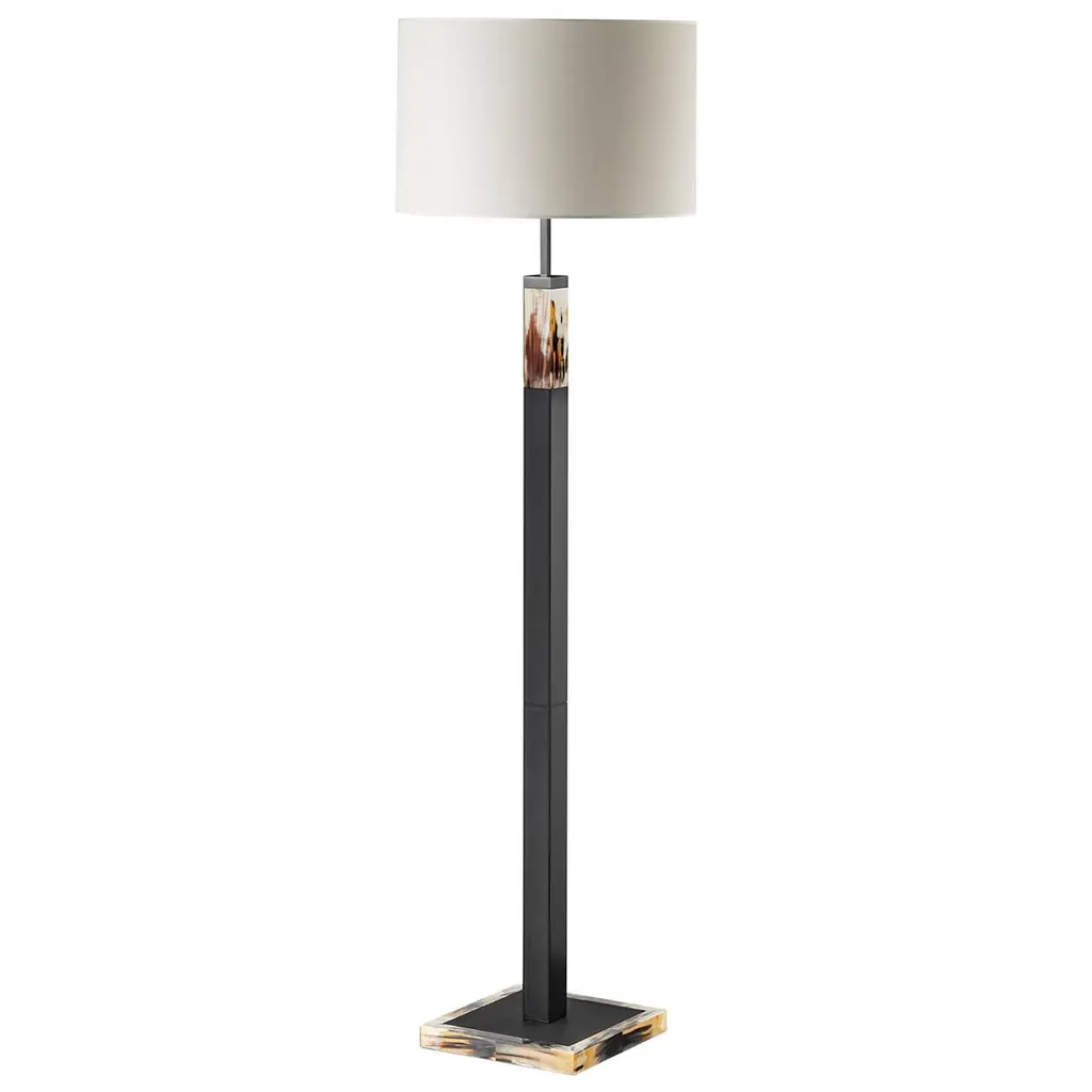 Elegant and timeless, the design of this floor lamp plays with pure geometric elements to create a splendid effect in any modern interior. Luxurious and stately, it features a slender, gunmetal brass stem rising from a sturdy, square base in the same finish, both boasting exquisite dark horn and leather details. A delicate, ivory lampshade in shantung completes this extraordinary piece of functional decor, which is customizable in finishes and dimensions. Please ask the Concierge for options and pricing.