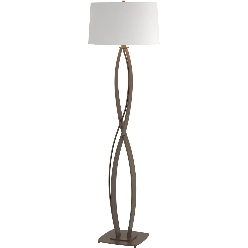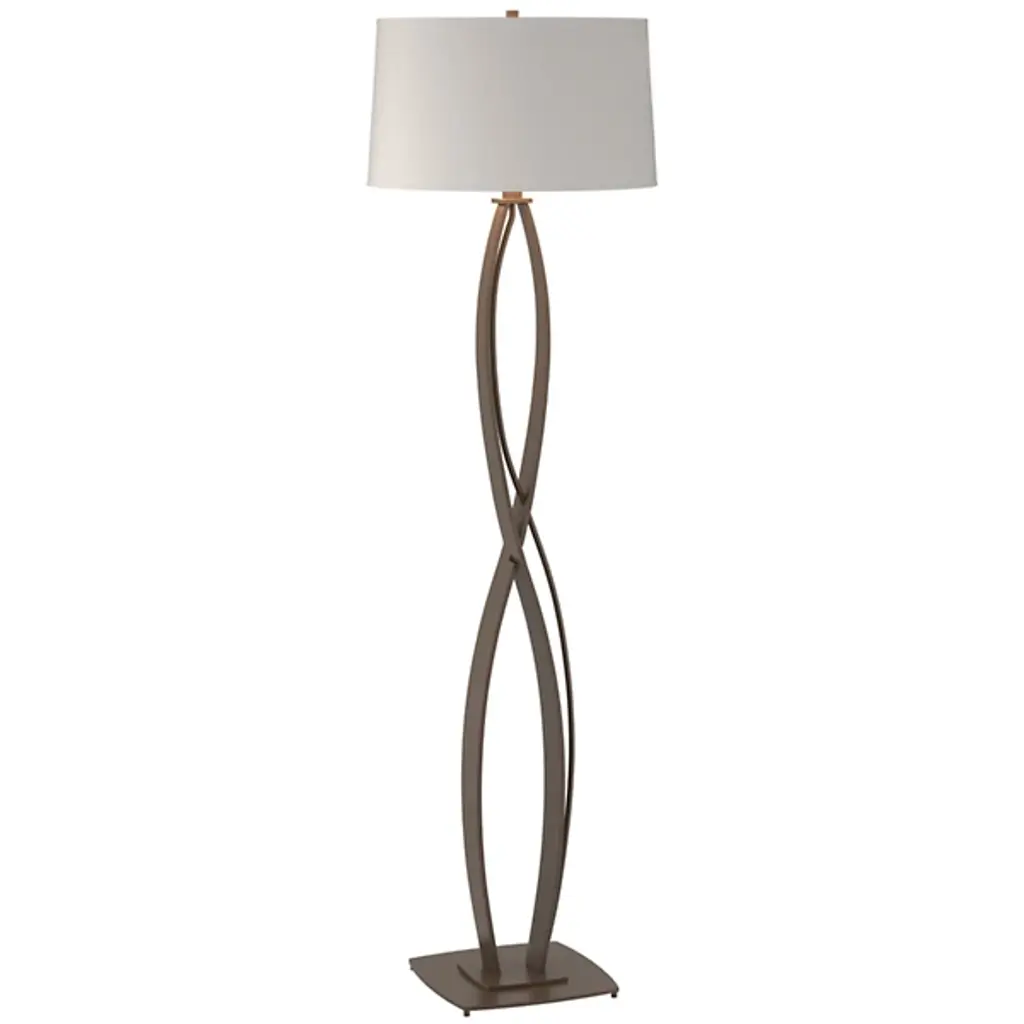 Appropriately named for its distinctive form factor, the Almost Infinity Floor Lamp by Hubbardton Forge attracts attention for its characteristic profile and high-functionality. The fixture’s most prominent feature is its stem that resembles the sign commonly used to convey infinity. The curves and base of the piece are made from hand-forged steel that’s both durable and unobtrusive in format. Atop the stem is a drum-shaped shade which houses the incandescent lamping. Provides a soft and diffused style of light.
