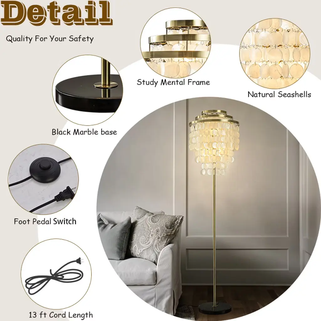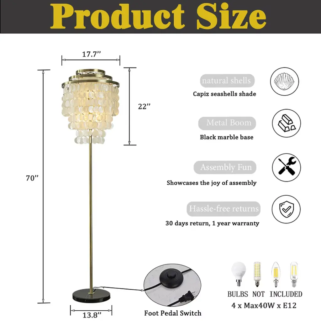 Transform your space with this stunning Modern Coastal Capiz Shell Tiered Floor Lamp, a perfect blend of vintage elegance and contemporary charm. Standing at 70 inches tall, this floor lamp features a beautiful tiered chandelier design adorned with natural white capiz shells, casting a soft, ambient glow that elevates any room's atmosphere. Setting up this floor lamp is quick and hassle-free. Simply screw the lamp pole sections together, hang the delicate capiz shells onto the frame, and plug it in. No tools or complicated steps required – you’ll have elegant lighting in minutes. Ideal for enhancing living rooms, bedrooms, dining areas, study rooms, or even restaurants, this versatile lamp suits modern farmhouse, coastal, French vintage, and glam decor styles. Bring home this unique capiz shell floor lamp and enjoy the perfect blend of style, functionality, and ease of use. Whether you’re creating a cozy reading nook or a sophisticated centerpiece, this lamp will instantly elevate your decor.