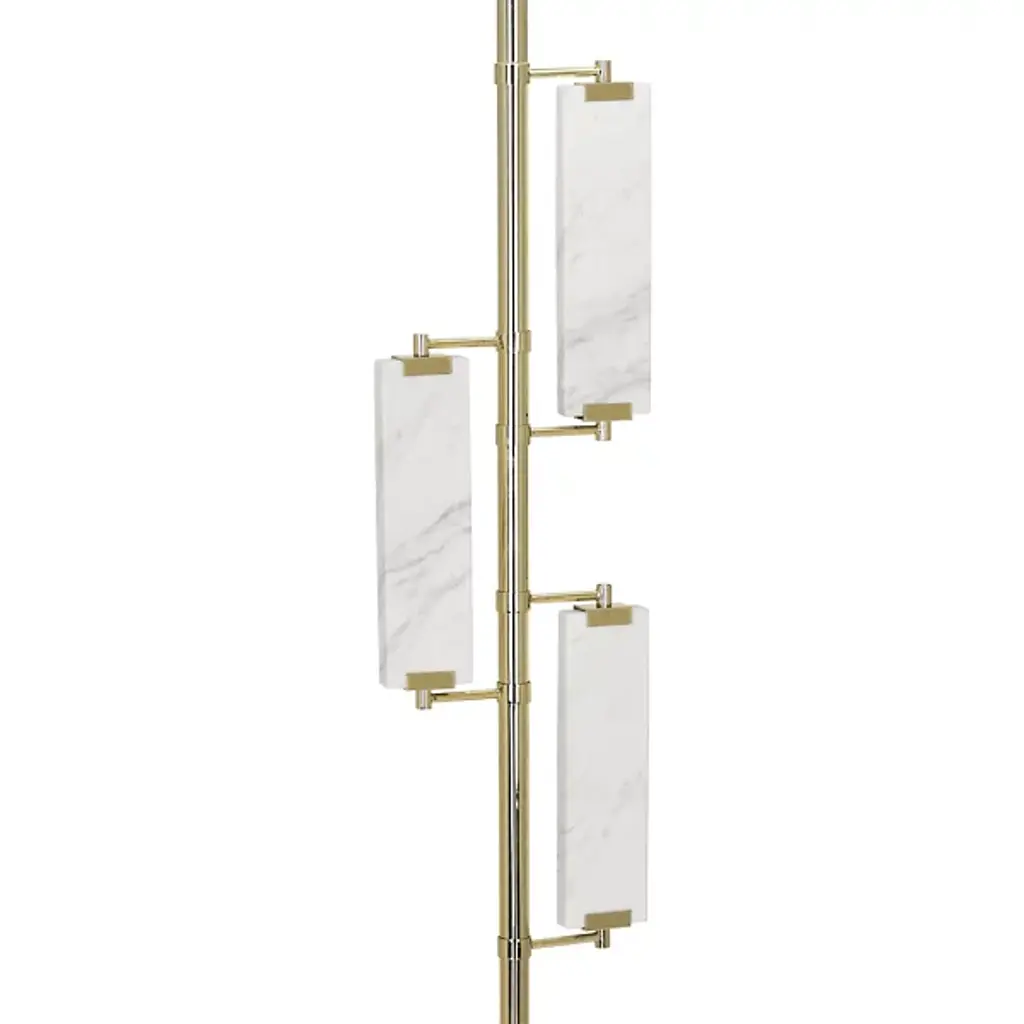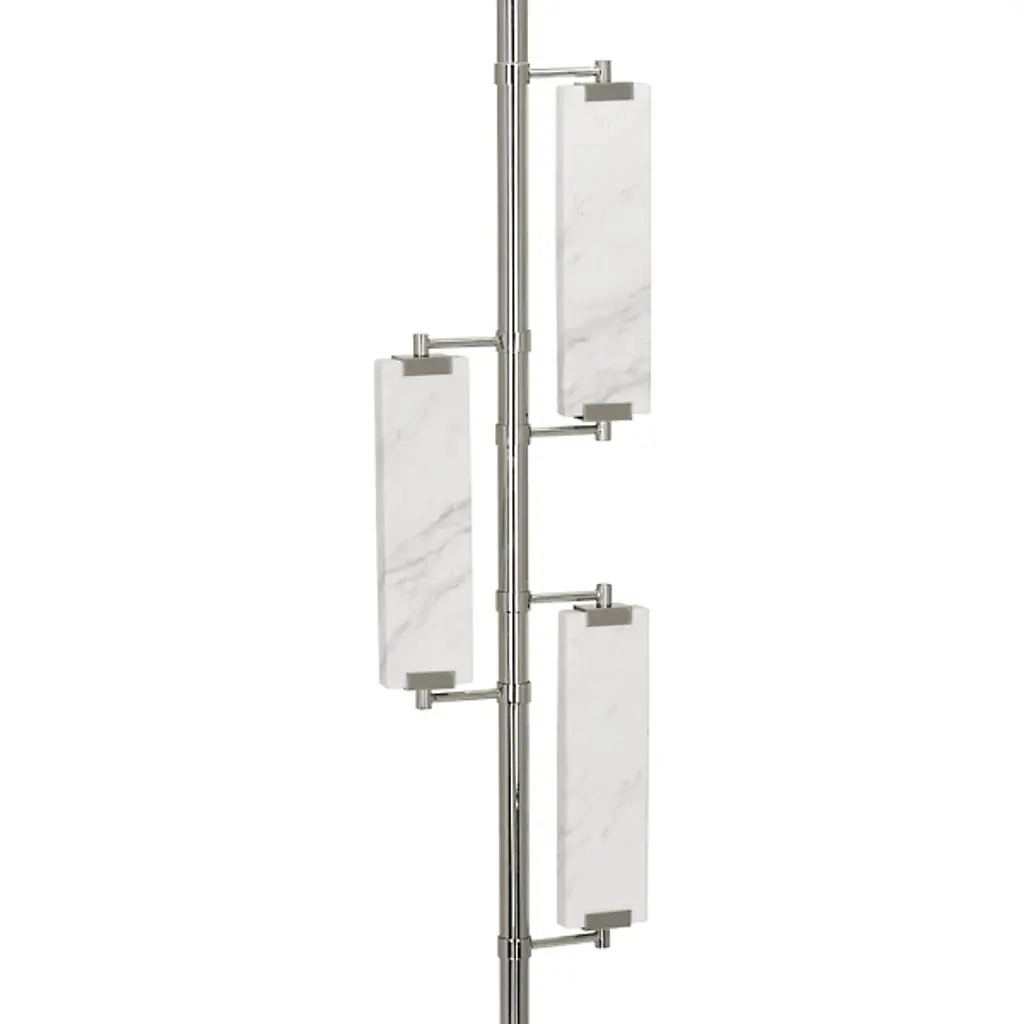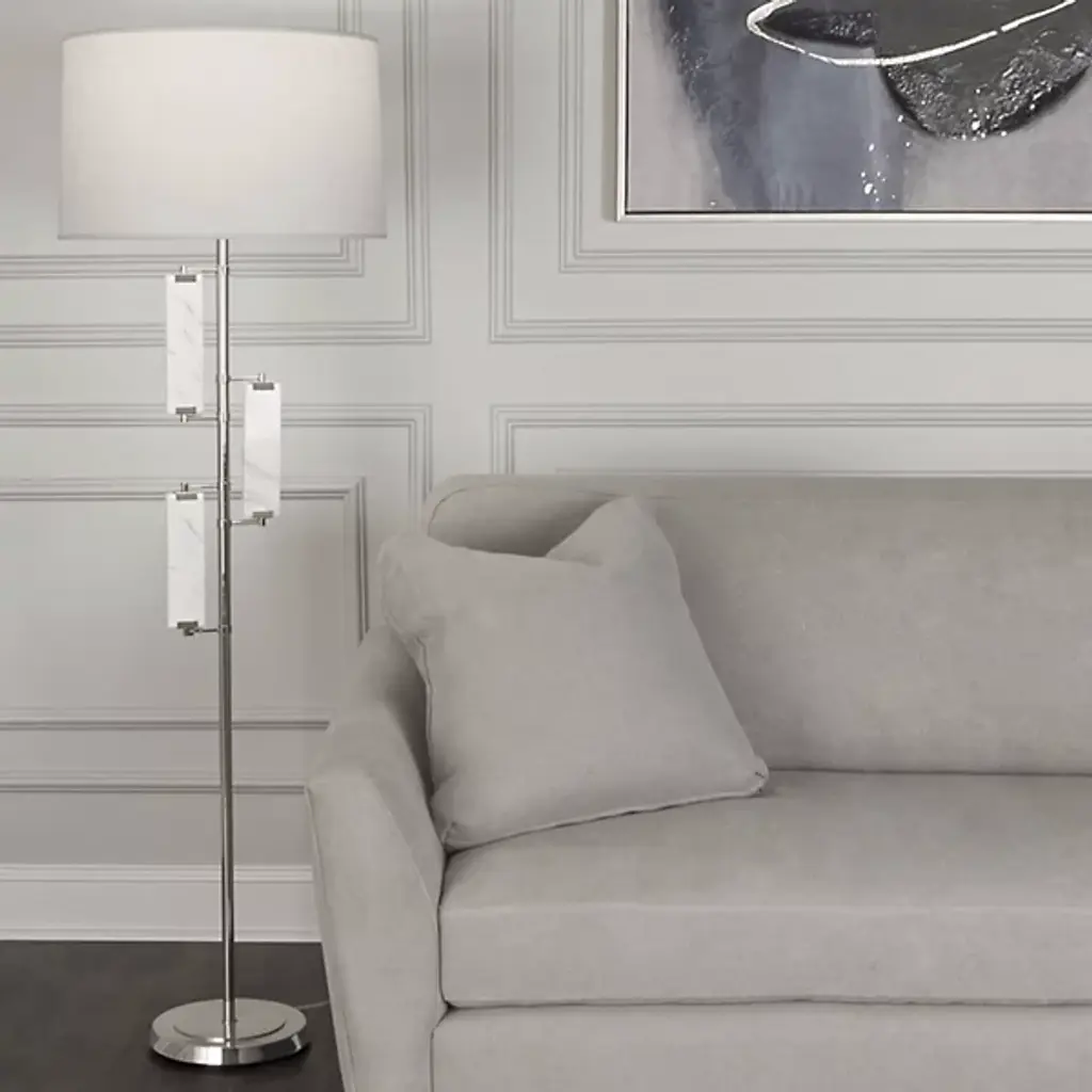 The Alston Floor Lamp from Robert Abbey gets the eyes jumping from one shape to the other with a veiny organic accent dressed in soft light. The floor lamp brings a modern aesthetic with a high-style personality. It makes efficient use of space with a stepped base and slender metal column. This column produces horizontal arms that hold out marble slabs in an elegantly tiered order. These slabs catch the eyes with shifting colors and gestural lines. The fabric drum shade on top keeps it classic and glare-free. A vertical light flows out of the drum to glaze the ceramic and produce a radiant image.