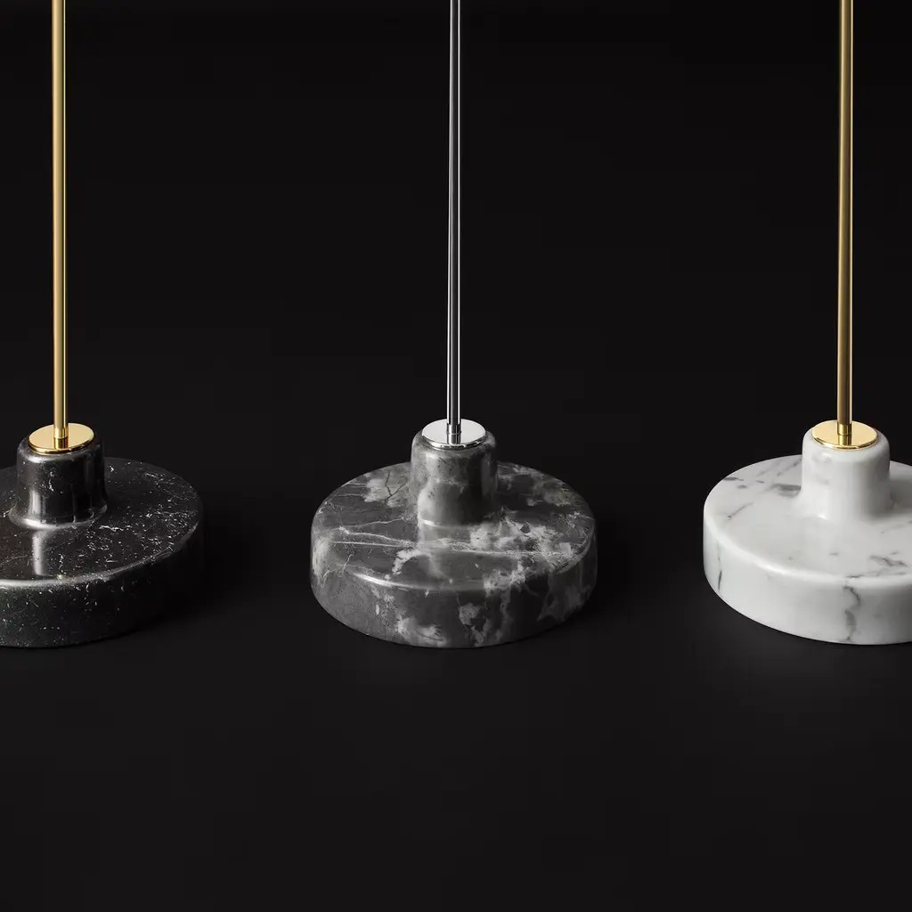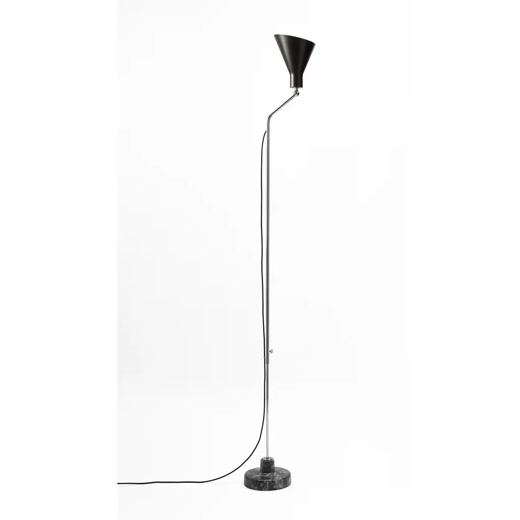 This modern lamp by Ignazio Gardella is an updated version of his original 1948 design. The main feature of this exquisite piece is the adjustable height that can extend from 124 to 216 cm, allowing maximum versatility in its use as a table and floor lamp. Sleek, slender, and artfully simple, this lamp provides task illumination with its cone shaped shade supported by a bent arm. The chrome-finished aluminum stem is balanced on a round base fashioned of gray marble, a sophisticated touch that will not go unnoticed.