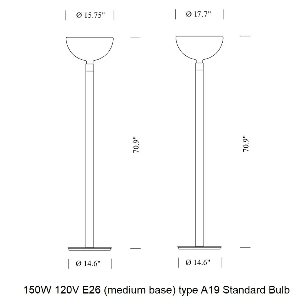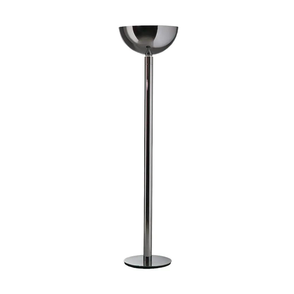 Floor lamp with chromed structure. Diffuser in opal white glass for the AM2C version and in chromed, black chromed or white metal for the AM2Z version. Uplight flood beam distribution, dimmer on the cable. Features
