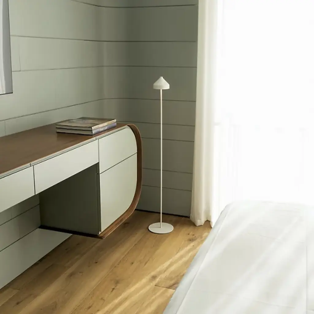 The Amelie LED Outdoor Floor Lamp from Zafferano America is designed by Sara Moroni. It is made from durable die-cast aluminum. Amelie comes with a versatile silicone hook and cap, letting you transform it into a suspension lamp. Equipped with a contact charging base, recharging the lamp is a breeze. Please note that the charging plug is not included. A base touch dimmer lets you adjust the brightness level of its integrated LED. Charging time is approximately 6 hours. Amelie boasts 200 hours of salt spray resistance.
