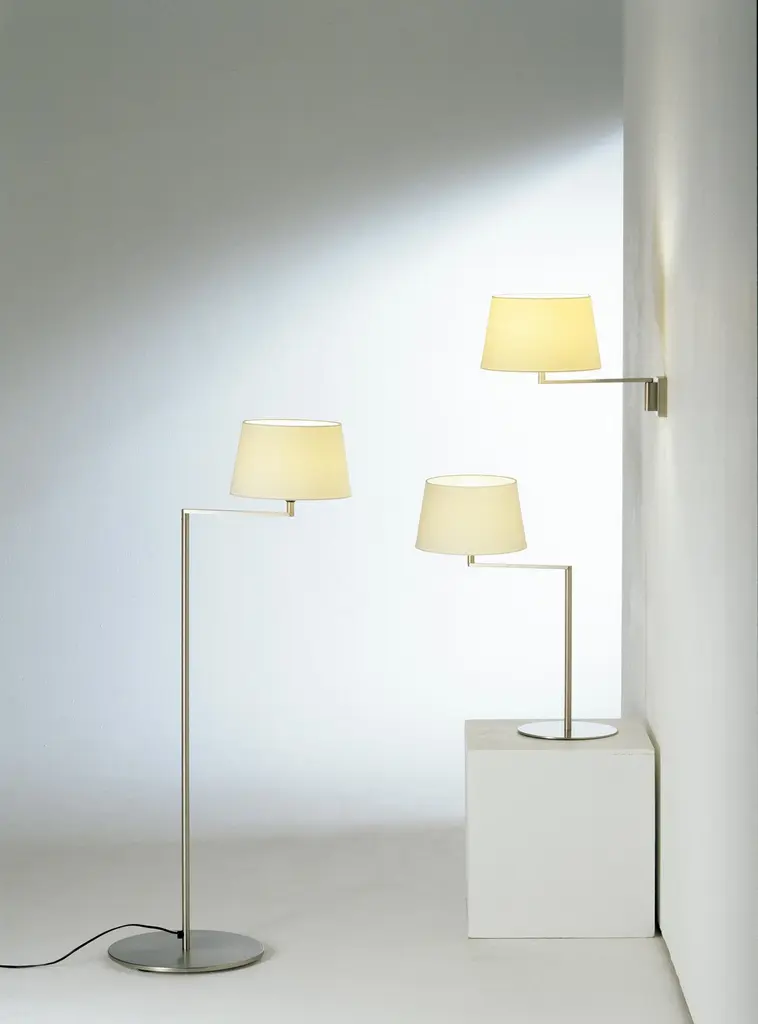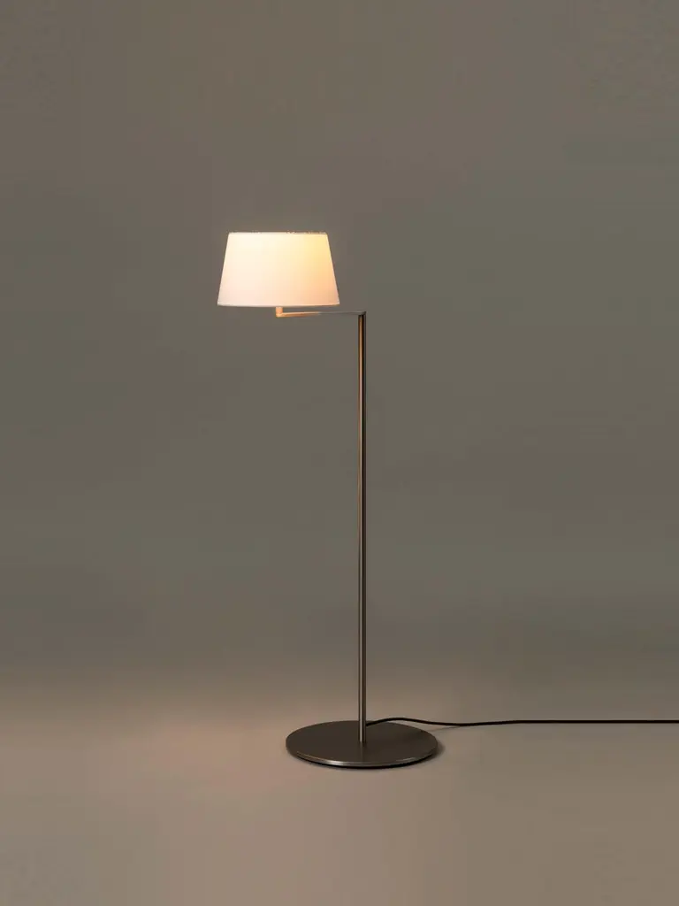 Americana floor lamp by Miguel MiláDimensions: W 33 x D 52 x H 112 cmMaterials: Satin nickel, linen.The Americana series is built around a satin nickel rotating arm holding an elegant white linen shade. The arm gently swivels the light nearer or further away, while the wide metal base stays put, in an evocation of the harmonic motion of swing dancing.Santa & Cole is a small, independent and global editor of design products, with its roots in Belloch (Barcelona, Spain). We have been editing since 1985, when the company was first founded. By editing we mean preparing a work for the public domain, we mean adapting an item for everyone’s use. What a book editor does with stories, we do with objects.More than eighty creators have contributed to a rich catalogue of furniture and lighting products originating in very different contexts, by renowned designers such as Antoni Arola, Miguel Milá, André Ricard and llmari Tapiovaara.Acute and attentive to quality and detail, Santa & Cole outsources all of its industrial production to an extensive network of suppliers, mainly in Spain, but also in other countries such as Japan, where the washi paper for our Tekiò lamp is made.Our mission is to build, safeguard and disseminate knowledge through design objects. Objects whose quality is recognisable at the touch of a hand, and that enrich people’s lives, whether at home or in shared environments. Our philosophy is more modern than futurist and we are more intrigued by silence than by stridency.Our focus is not the present market, but the future one; not Barcelona, but the world; not fashion, but history.All our lamps can be wired according to each country. If sold to the USA it will be wired for the USA for instance.