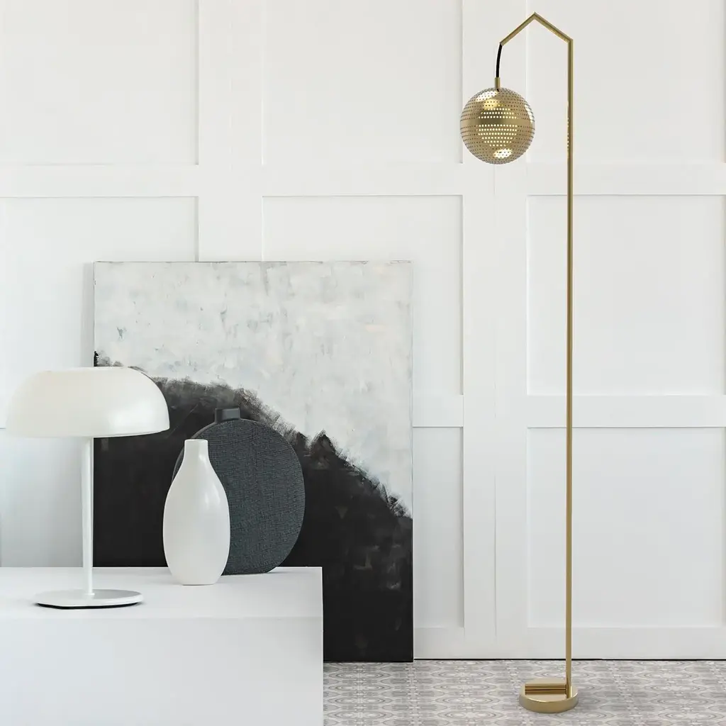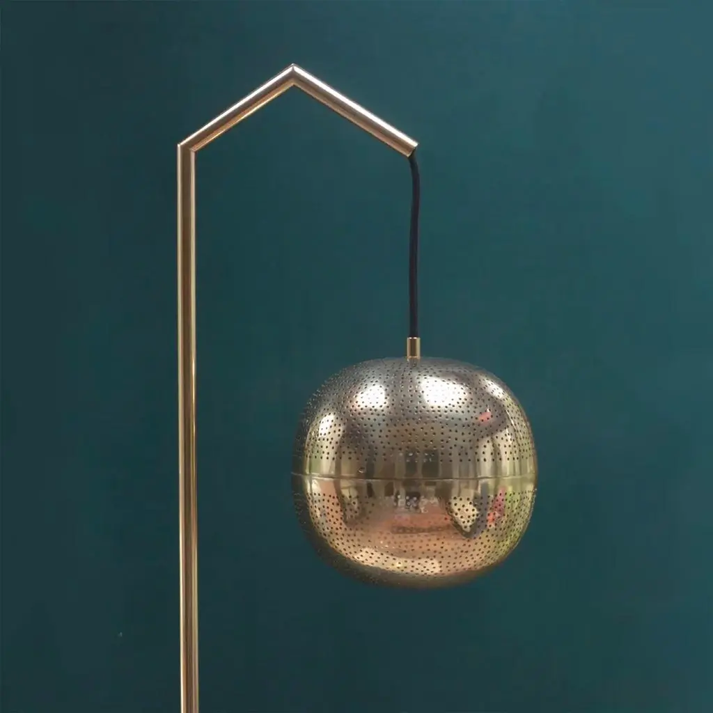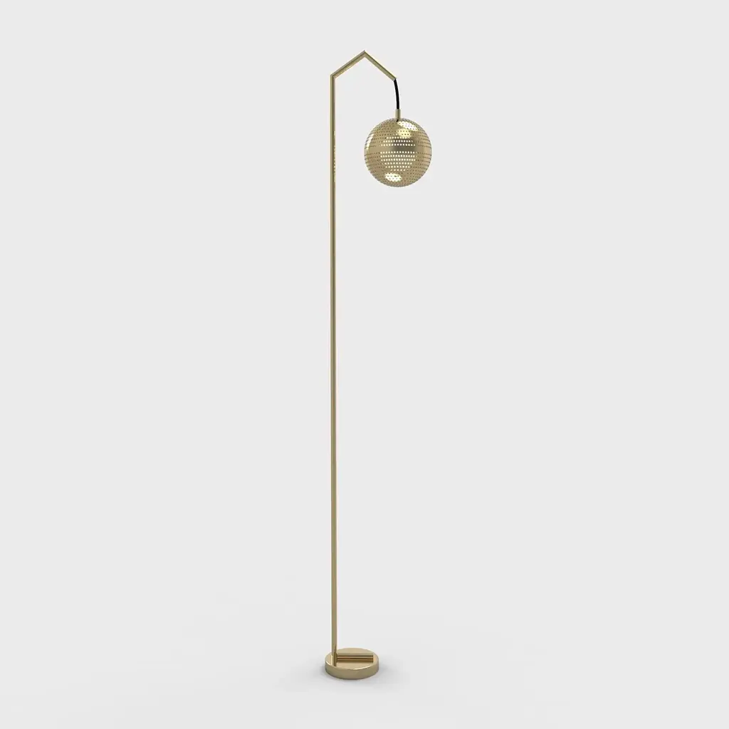The Amur Brass Floor Lamp is a modern solid brass light with traditional Moroccan ornamental design. The handmade solid brass lamp light has a globular shade that hangs from an angular metal arm and extends from a linear body. Brass floor lamps stand tall from the floor, perfect for a seated task such as reading. Situate the Amur brass floor lamp next to a couch, chaise, or standing desk. Each unique solid brass floor lamp is made with locally sourced metal and sealed with a top coat to preserve its color.