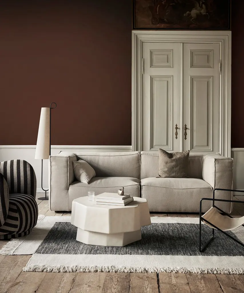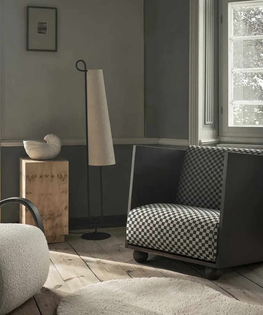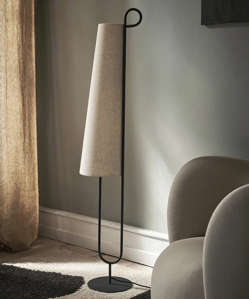 The Ancora Floor Lamp derives its name from the Italian word for 'anchor,' drawing inspiration from its distinctive shape. The warm and textured textile lampshade beautifully contrasts its powder-coated iron base, resulting in a poetic and vintage-inspired expression. This design effortlessly balances lightness and materiality, creating an enchanting ambiance in any space.Designed and produced by the Copenhagen-based studio Ferm Living.
