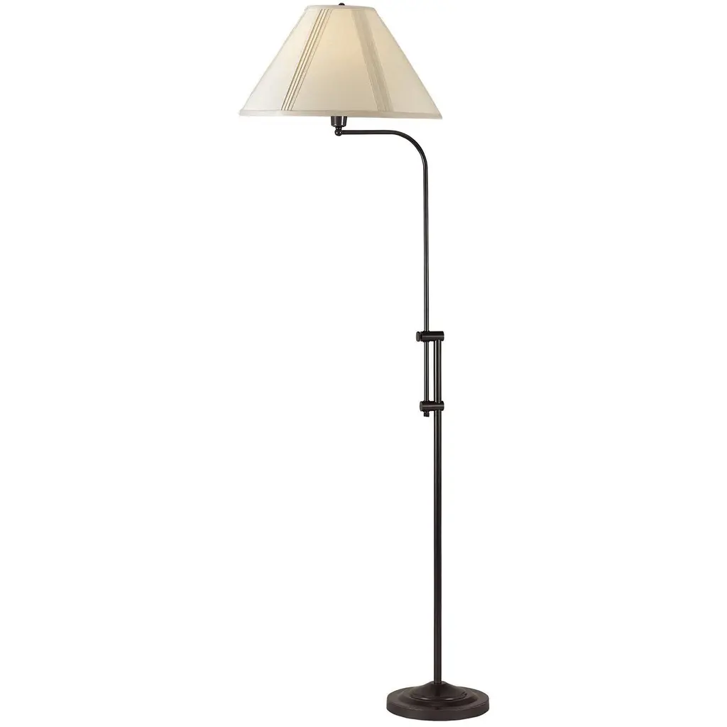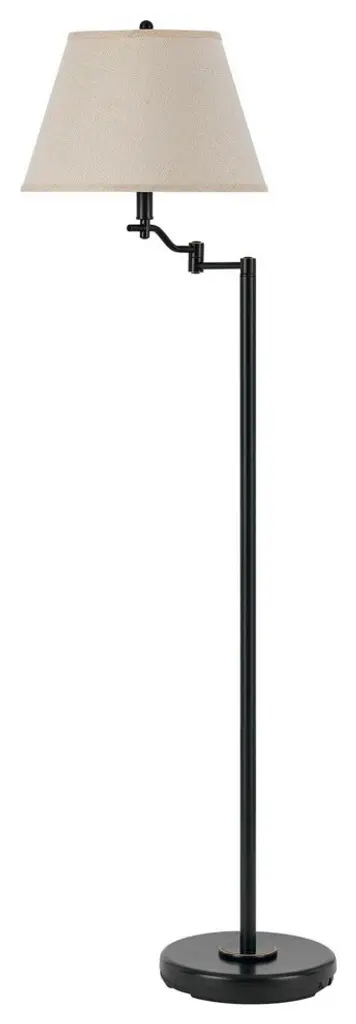 Up your style with this floor lamp that takes a charmingly unique stance on lighting. Simply turn the pair of knobs on the sculptural metal base to adjust the light to the perfect height. How delightful. Black finished metal floor lamp. Drum hardback shade. Adjustable Arm. On/off switch. (1) E26 socket, type A bulb recommended - 100 watts max or 23 watts wax CFL recommended. Matching table lamp - L734252. Signature Design by Ashley is a registered trademark of Ashley Furniture Industries, Inc.
