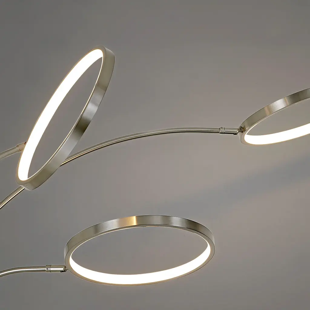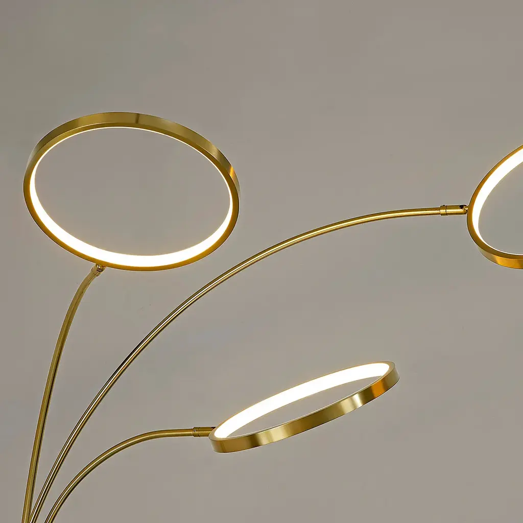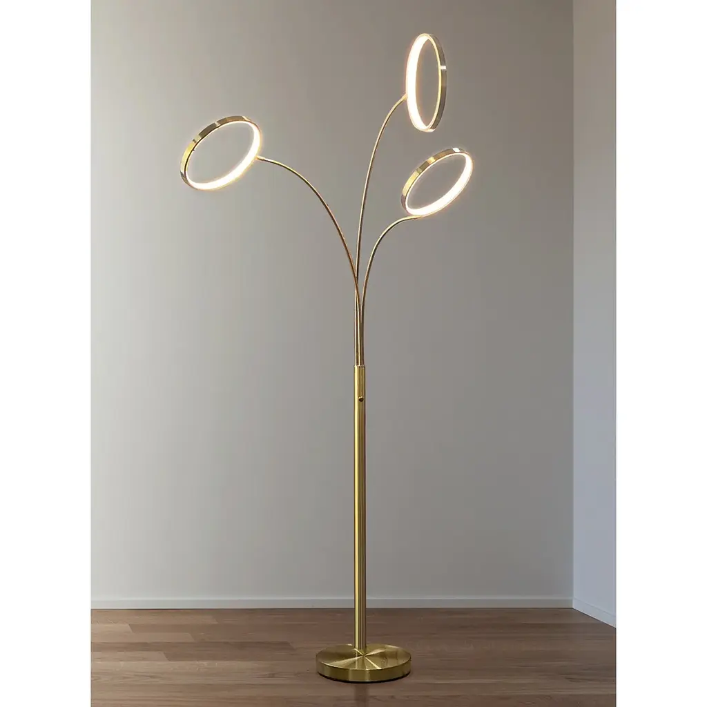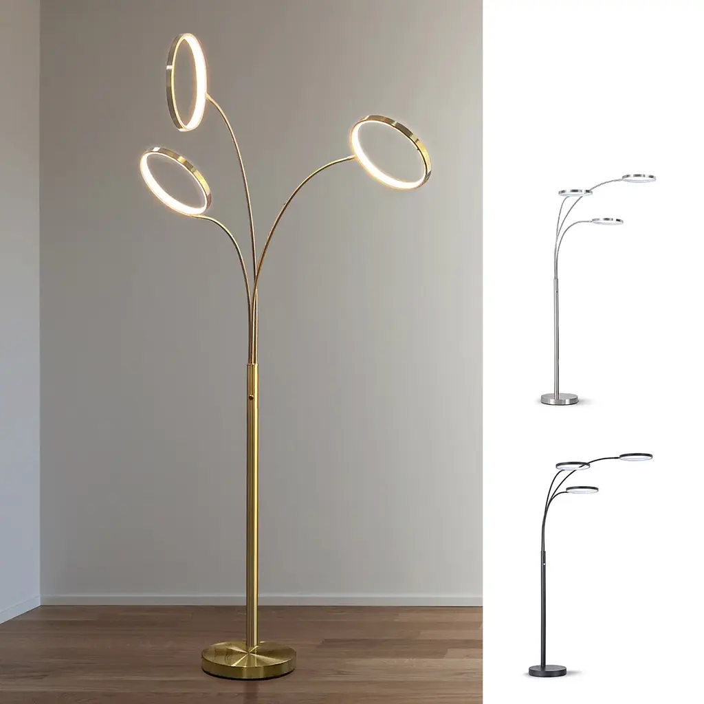 Introducing Angels LED Floor Lamp, a sleek and stylish addition to your home decor. This metal floor lamp boasts three swivelable arches at heights of 80", 75", and 68", each featuring a 12"ø Ring Style LED light for a total of 27W of high bright 3000K warm light. The angle adjustable lights are controlled by a convenient 4-level touch dimmer for easy customization. Elevate your space with the modern design and functionality of the Angels LED Floor Lamp.Features: