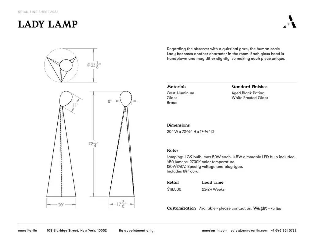 Regarding the observer with a quizzical gaze, the human-scale Lady becomes another character in the room. Each glass head is handblown and may differ slightly, so making each piece unique.