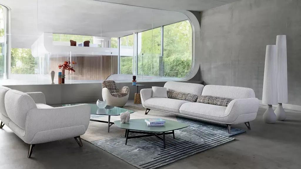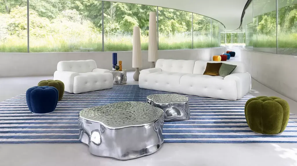 When Fabrice Berrux first saw the prototype of the floor lamp he had designed, the image of a pointed mountain partly covered in eternal snow came to mind. Naming it “Annapurna" became an obvious choice. Its rounded mineral base rises skyward, thanks to a long, slender banded shade that diffuses a light that is both powerful and soft.