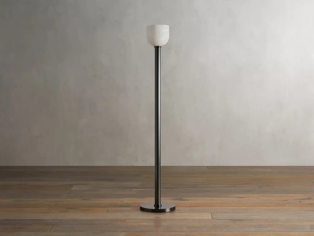 Crafted from steel and natural alabaster stone, Ansley’s torchiere silhouette casts a warm glow upwards while highlighting the delicate swirls and unique veining found in natural alabaster.