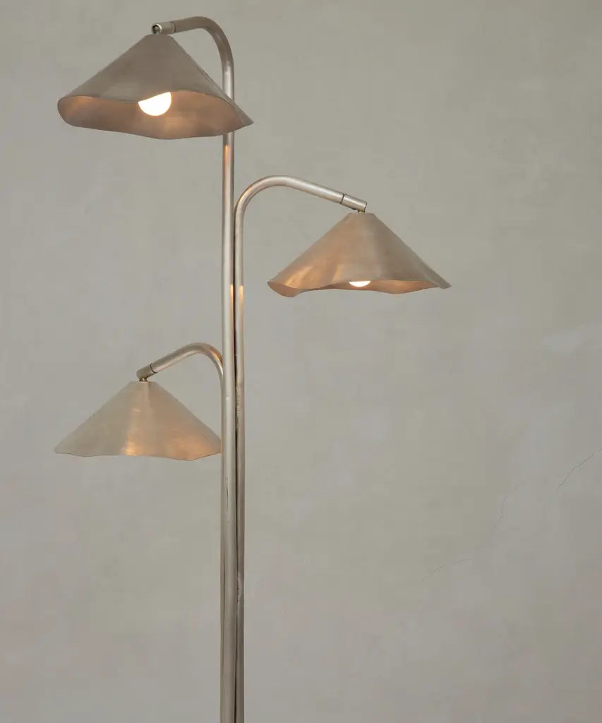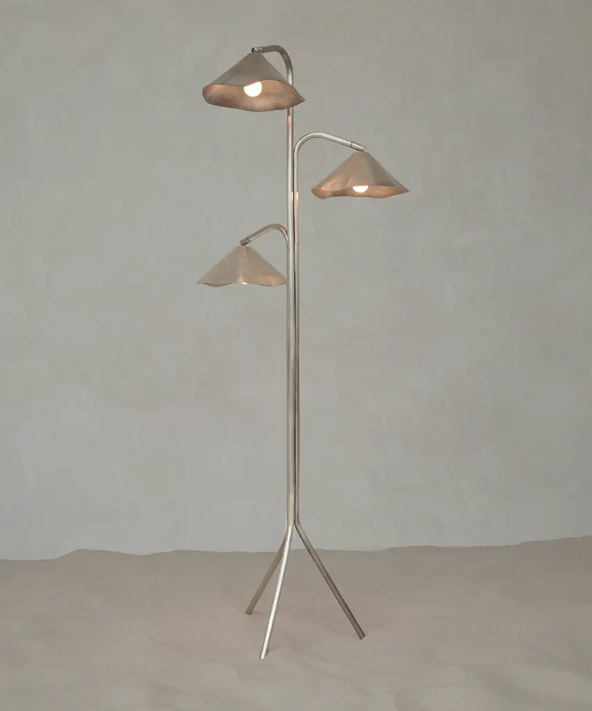 A pre-Hispanic smithing tradition thrives by recycling copper scraps into contemporary lighting fixtures. Originally copper was mined by indigenous people to elaborate masks, chains, and other objects as an offering to the Tarascan gods. Shown in brushed silver. Designed by OHLA STUDIO in union with artisans and localities steeped in centuries of craft and trade.
