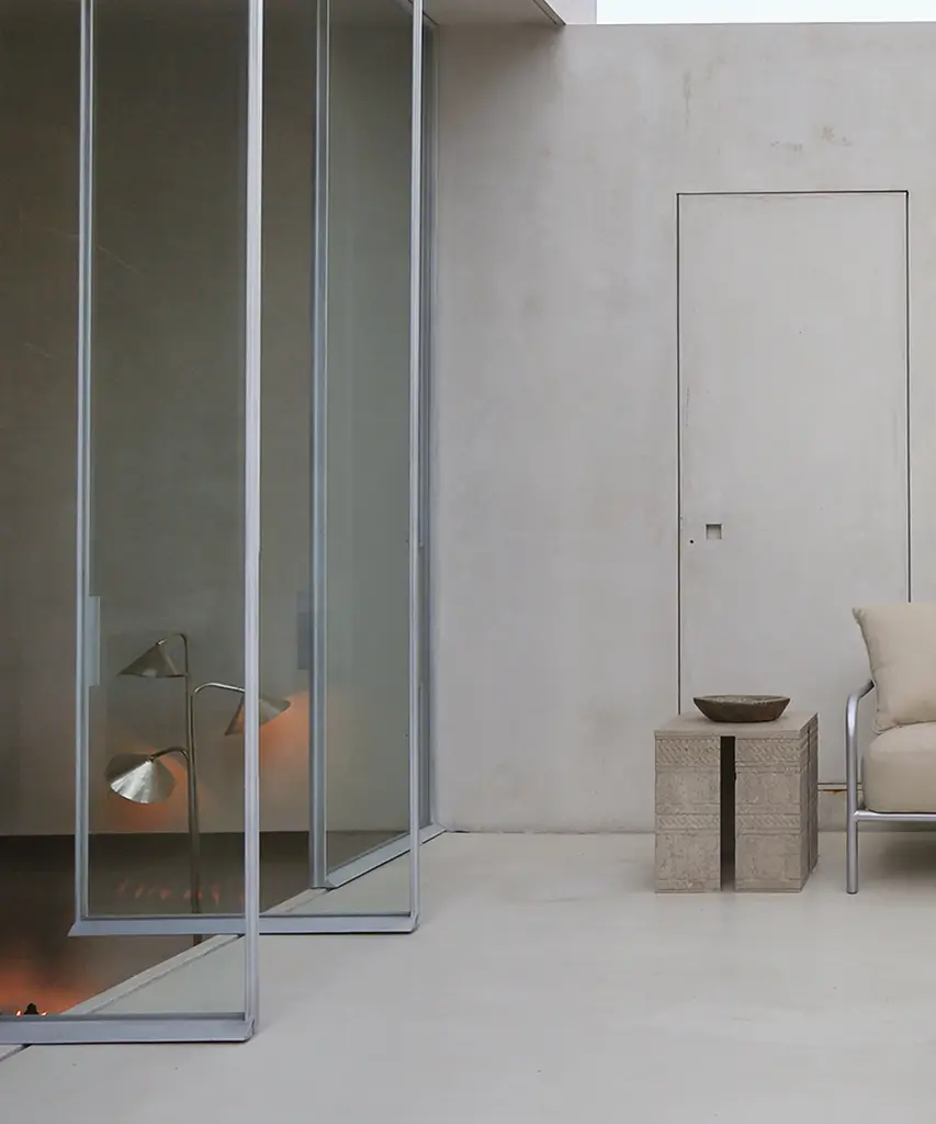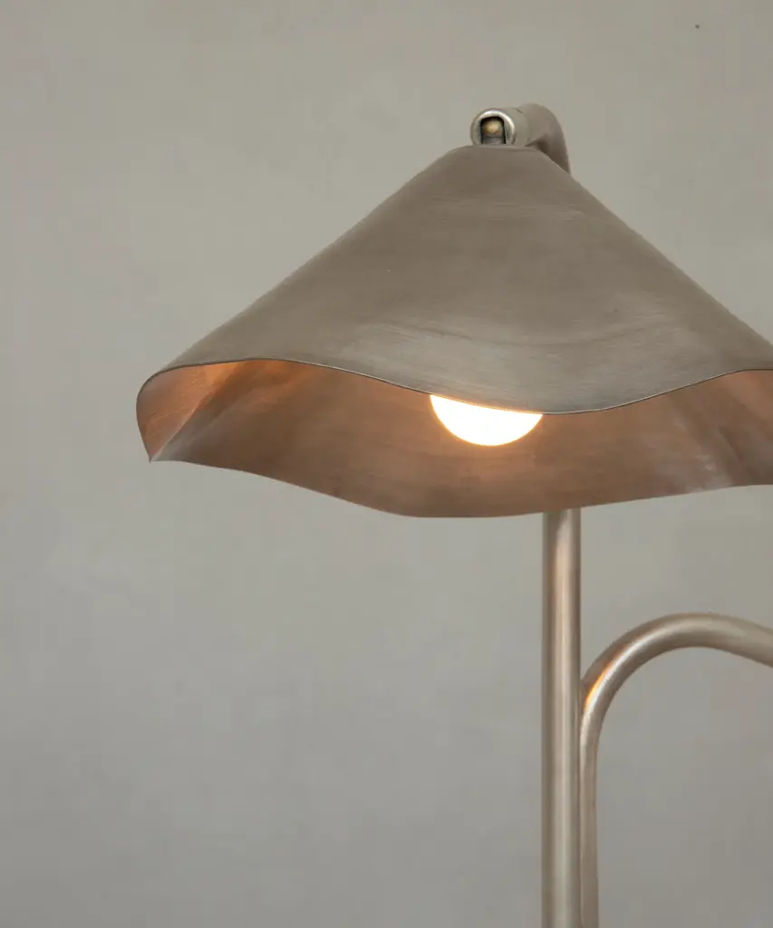 A pre-Hispanic smithing tradition thrives by recycling copper scraps into contemporary lighting fixtures. Originally copper was mined by indigenous people to elaborate masks, chains, and other objects as an offering to the Tarascan gods. Shown in brushed silver. Designed by OHLA STUDIO in union with artisans and localities steeped in centuries of craft and trade.