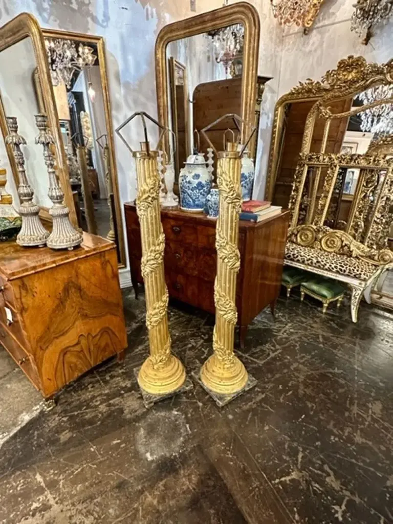 Handsome pair of 19th century Italian carved and giltwood columns made into floor lamps. These are very large scale and make an elegant statement. Lovely!!