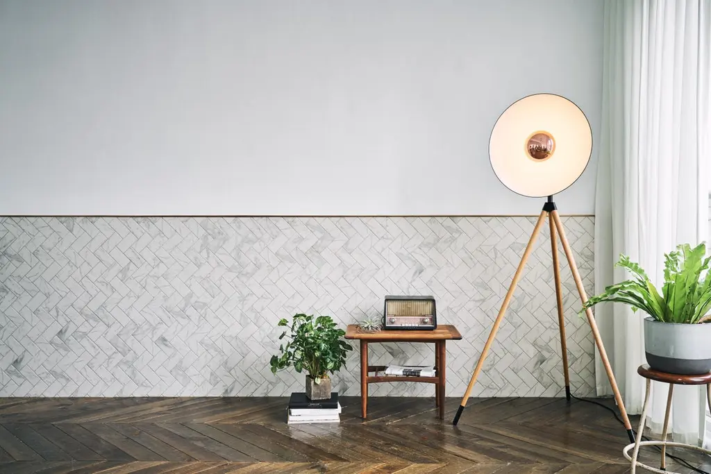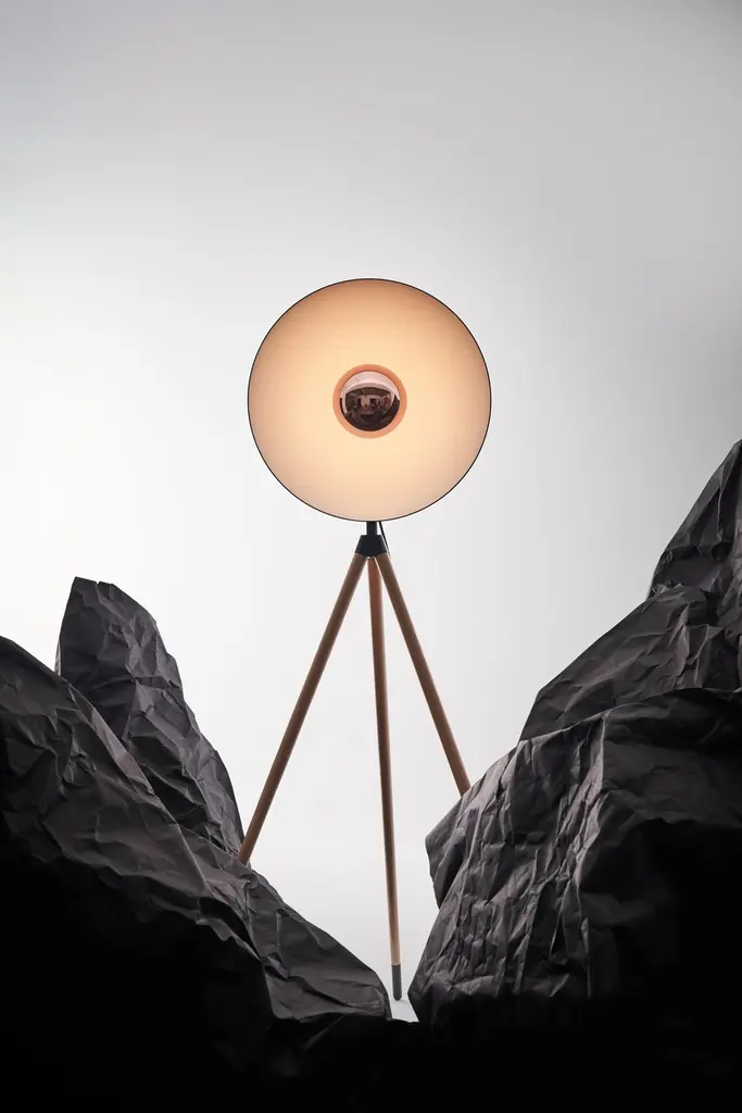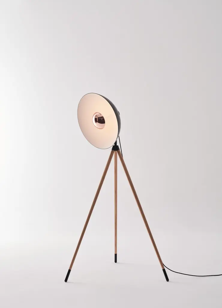 The huge shade embraces and sheds the light at the same time, while the LED module is integrated behind the metal cap, preventing the light from being visible and causing glare. APOLLO Mega Floor Lamp is married with wooden tripods along with a touch-dimmer device, allowing users to enjoy flexible modes like being in nature.Material:Aluminum & woodColor:Matt black + copper + beech woodMatt black + copper + black woodLight Source:LED 17W 2700K CRI90 1210lmSize:L 37.4" x W 32.7" x H 74"Feature:touch dimmer switch