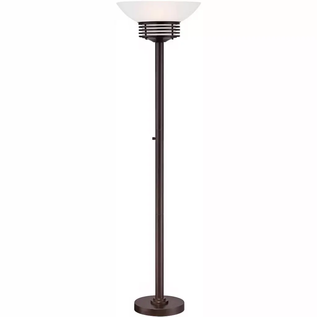 The Aries floor lamp provides efficient ambient lighting for an entire room in a slim design. Simplicity shines in this look with a matte black finish and a tapered frosted plastic shade. An Adesso patented 300 Watt Double Socket construction allows for two crisscrossed sockets, each holding on/off 150 Watt incandescent or LED bulbs which provides approximately 3 times more light than a typical torchiere. A simple high/low rotary switch is located on the pole to adjust the brightness. This lamp has a black cord and is smart outlet compatible. Bulbs are not included. The three-way switch adjusts the light from low setting, high setting to off position. Use incandescent bulbs up to 150W or dimmable led bulbs (DO NOT USE: 3-way bulbs or CFL's)