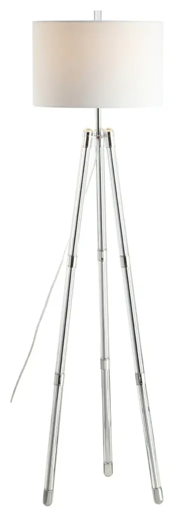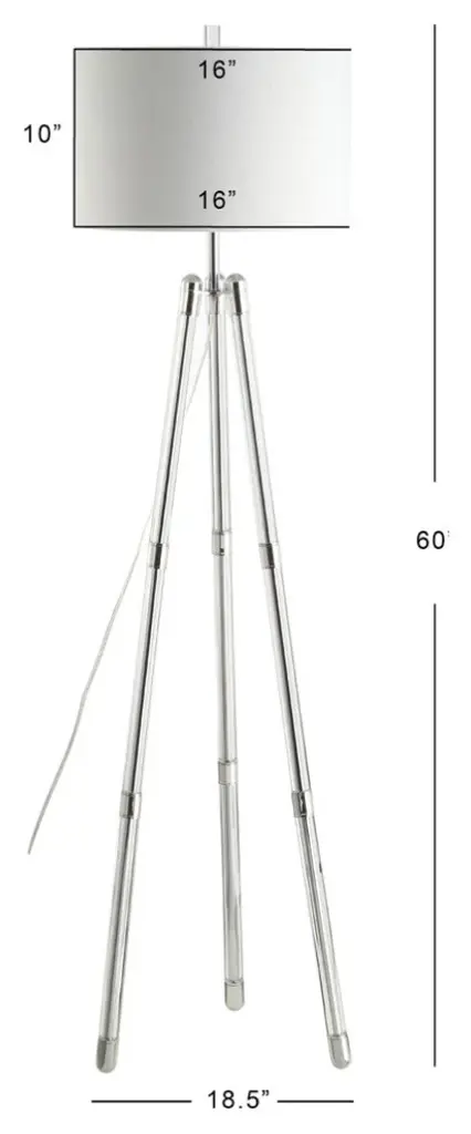 The timeless surveyor''s tripod lamp is re-interpreted as a glamorous, modern floor lamp in glass and chrome. A statement piece for the living room, den, or office, this lamp features an ivory linen drum shade and bright included LED bulb. A black silk-wrapped cord is an elegant finishing touch.Features:• This bright and stylish floor lamp is perfect for a reading nook• Beautiful to display or easy to conceal: the cord is wrapped in black silk• Eco-friendly 9W LED bulb included• Takes 1 bulb and compatible with any 12W LED or 100W TYPE "A" or 23W CFL• UL Listed • Color: Chrome with white shade• Body Material: Metal/Crystal• Includes: One (1) lamp• Assembly RequiredDimensions:• Lamp: 60 inches high x 18.5 inches wide x 18.5 inches deepAbout us:You see a lamp.We see a decorative work of art.A perfectly curved shade casts a dramatic shadow on a floor. A silk cord you never want to hide. Compatible with LED lightbulbs: as easy on the environment as they are on the eyes. The JONATHAN Y Lighting collection considers every detail from impeccably sourced materials to designer styling. And our prices are so attractive, we''ve transformed a functional necessity into a fashion accessory.JONATHAN Y Lighting - a fashion revolution in home decor.