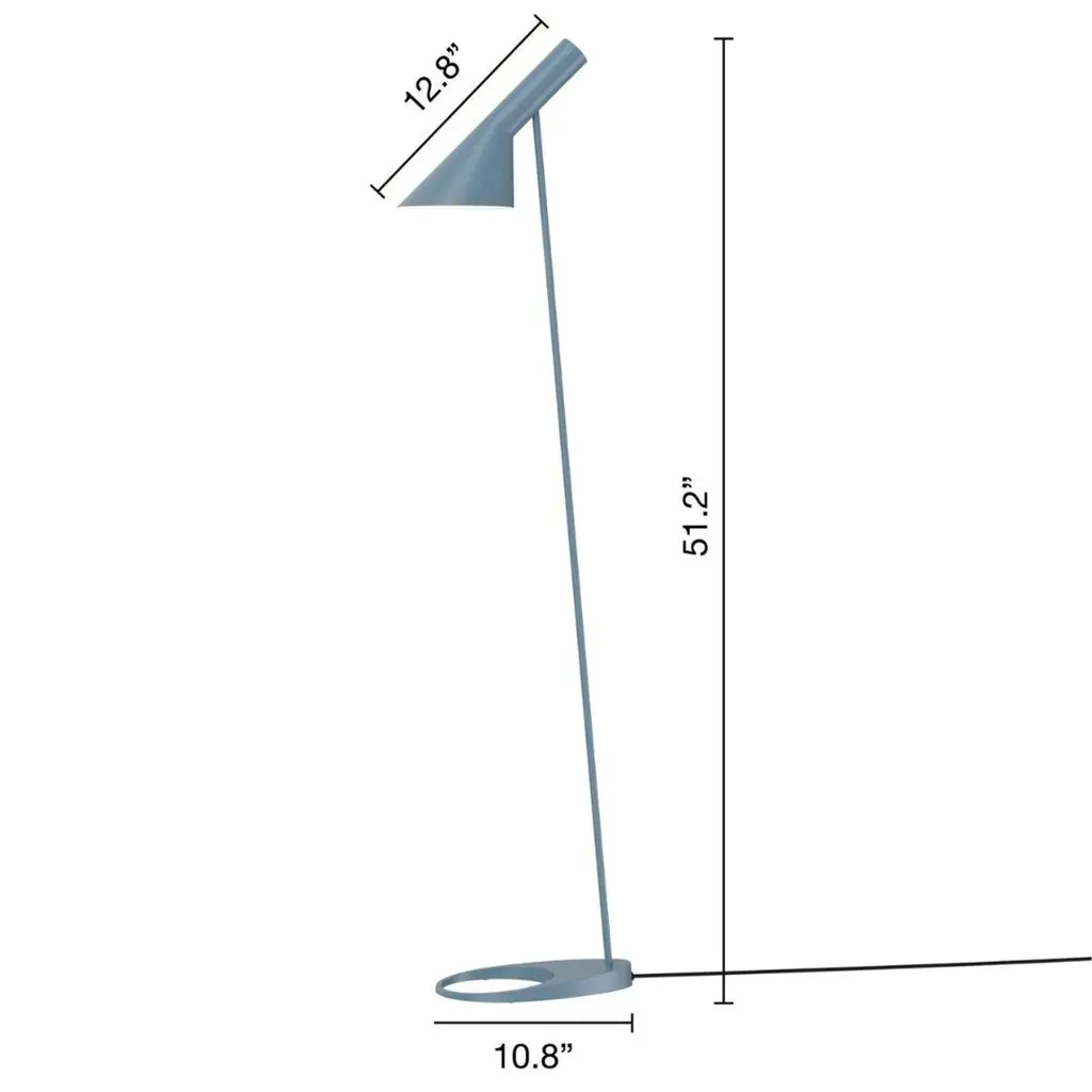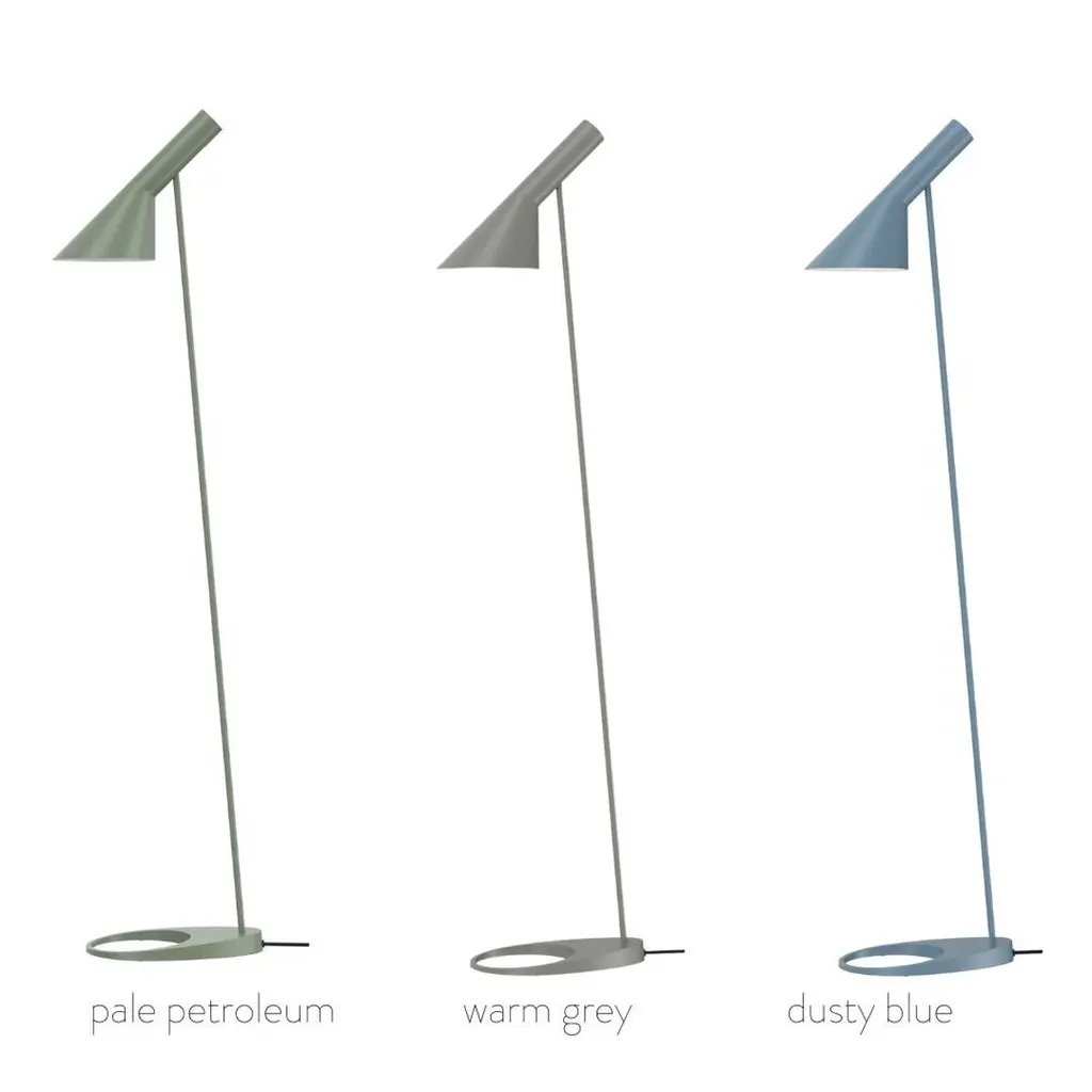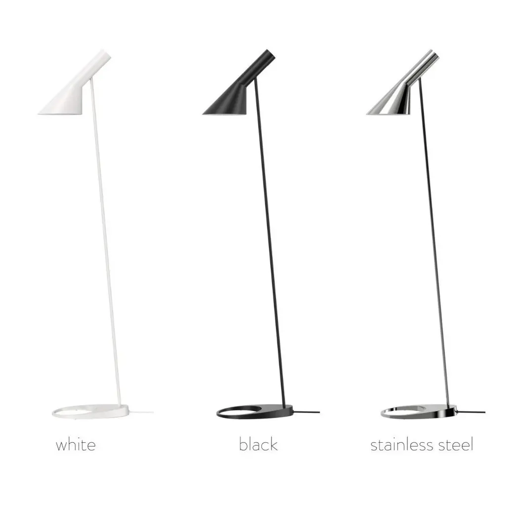 Arne Jacobsen AJ Floor Lamp in Stainless Steel for Louis Poulsen.The AJ series was part of the lighting collection renowned Danish designer Arne Jacobsen created for the original SAS Royal Hotel in 1957. Today, his furniture and lighting designs are sought after by collectors worldwide. Executed in steel and zinc, the iconic shade on the AJ floor lamp emits a comfortable, downward focused light for task lighting or an interior accent. The adjustable shade is painted white inside to further soften the light. The AJ Lamp remains among Arne Jacobsen’s most well-known designs.Price is per item.Available in 9 colors: polished stainless steel, black, pale petroleum, white, dusty blue, electric orange, soft lemon, warm grey, and warm sand. Wet painted. Also available in an outdoor and indoor wall light, a larger table lamp, and a mini table lamp.Accommodates a single E26 60w maximum bulb or LED equivalent. UL listed. Black cord is 7.8 feet with switch on cord. Authorized re-edition. New in box from Louis Poulsen with warranty.In-stock lead time 2-3 weeks. Out of stock can take 6 weeks or more. Inventory availability can change without notice. Please inquire for time-sensitive projects.