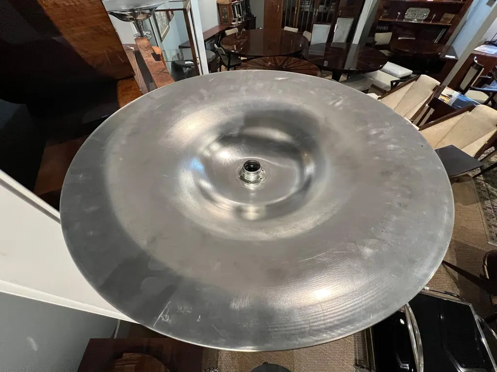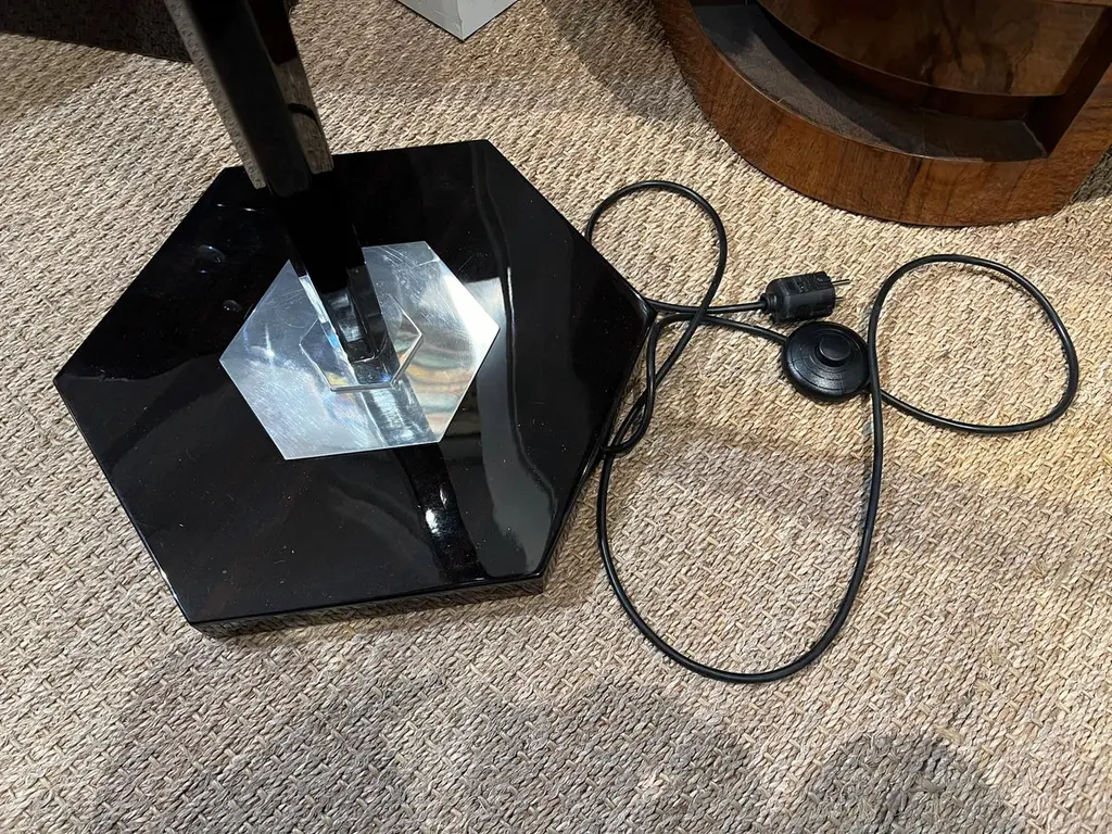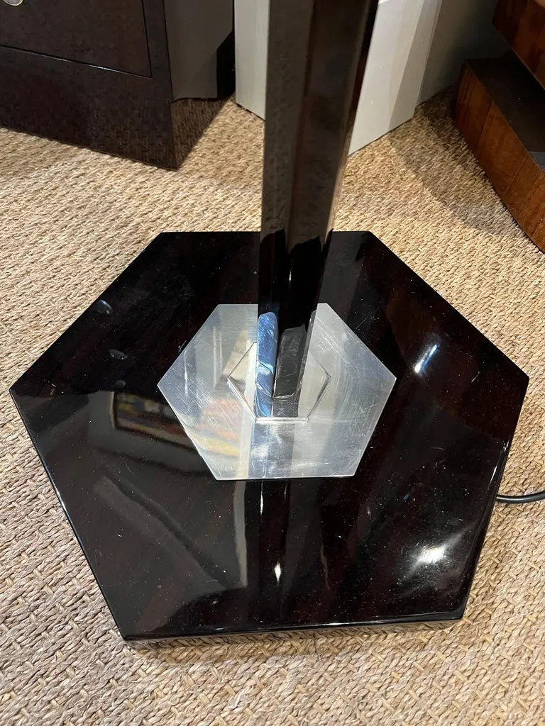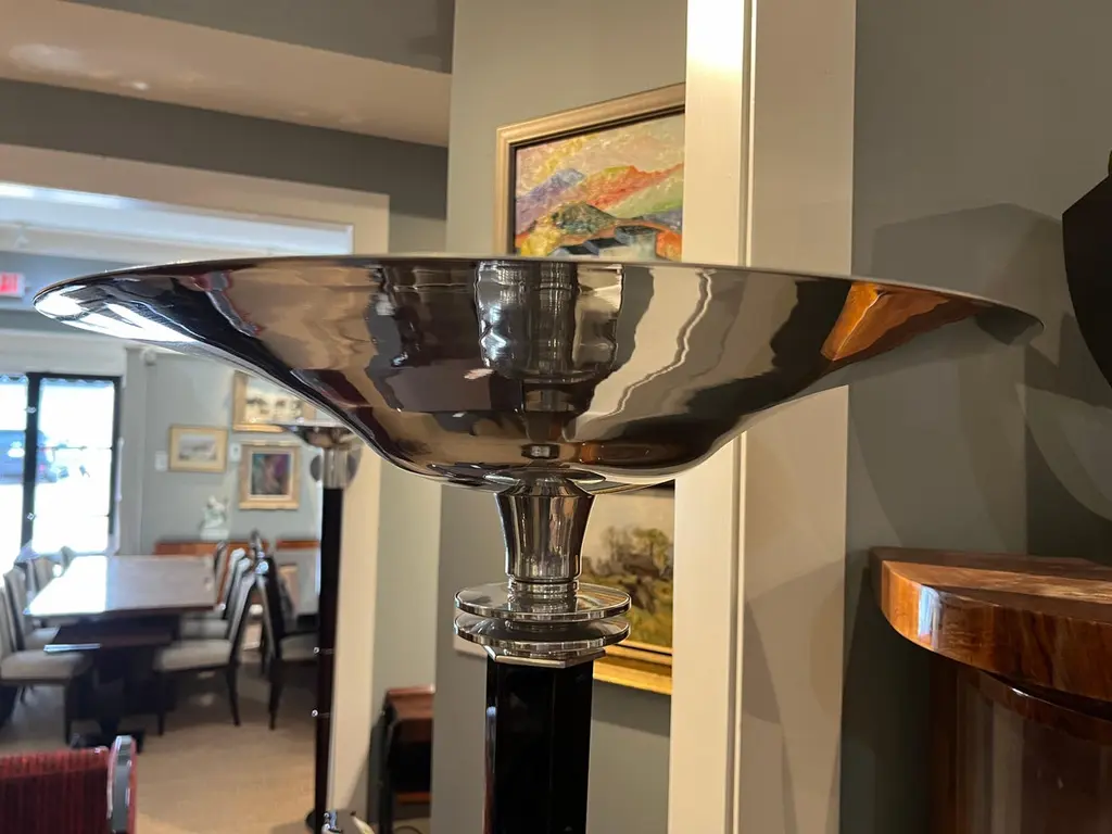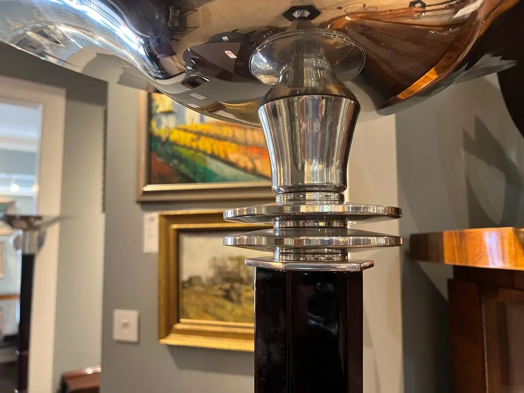Art Deco French Floor Lamp in Beechwood with chrome decorative elements. Highly polished lampshade supported by hexagonal leg resting on a hexagonal base. The condition is good. Restored, rewired.A US adapter is included. France, c. 1940s74.5"h x 23.5"w (lamp shade) x 18"w (base)