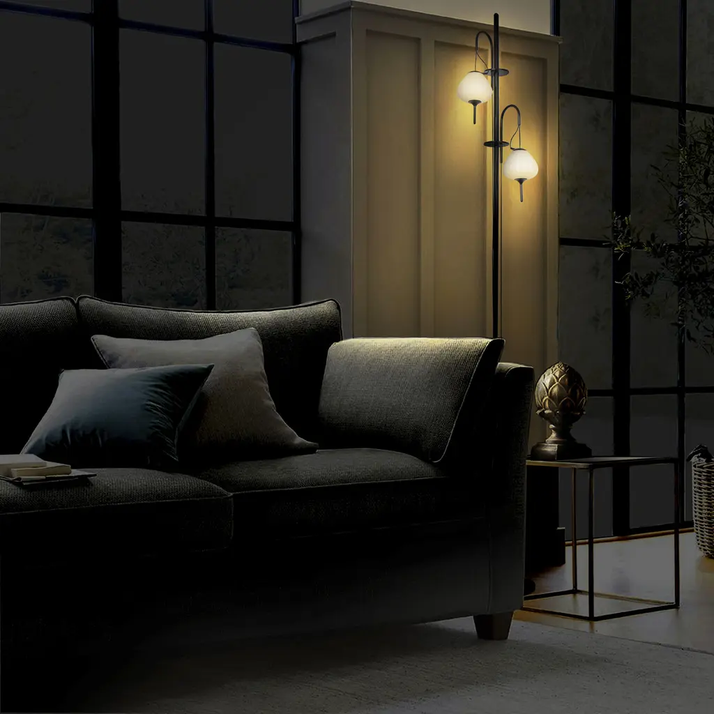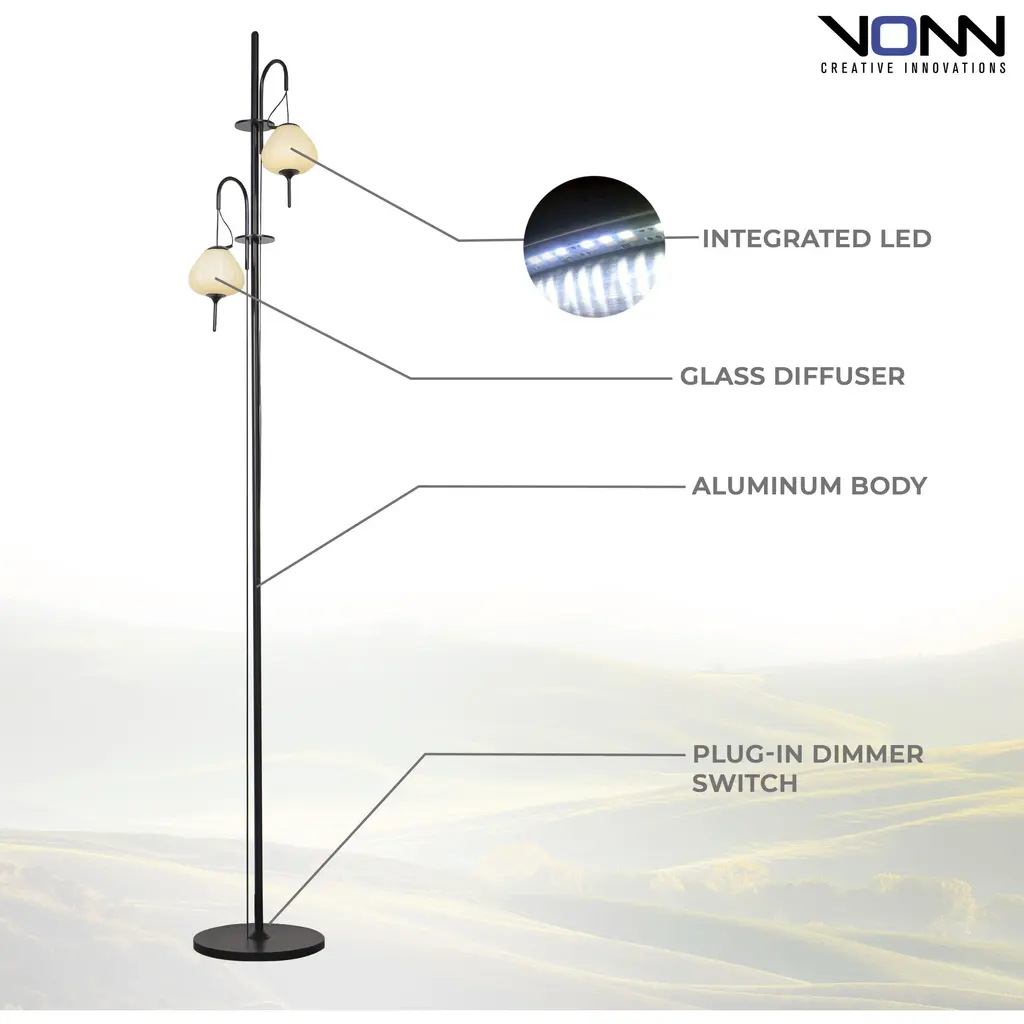 From VONN's Lecce Series, the VAF5222BL Integrated LED Floor Lamp is a modern 70-inch fixture made from aluminum, iron and glass, with a Black finish and 2 Integrated LED Shades. The shades consist of a Glass Sphere in the shape of a teardrop. Emitting a soft white ambient light at 3000 Kelvin, it offers dimmable functionality. With 394 Lumens brightness, an energy-efficient power consumption of 11 Watts, and CRI 90, this floor lamp combines style and efficiency for versatile and customizable illumination.