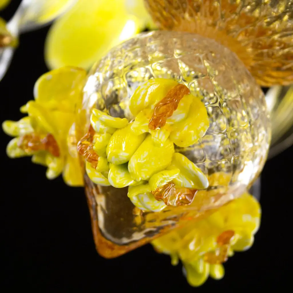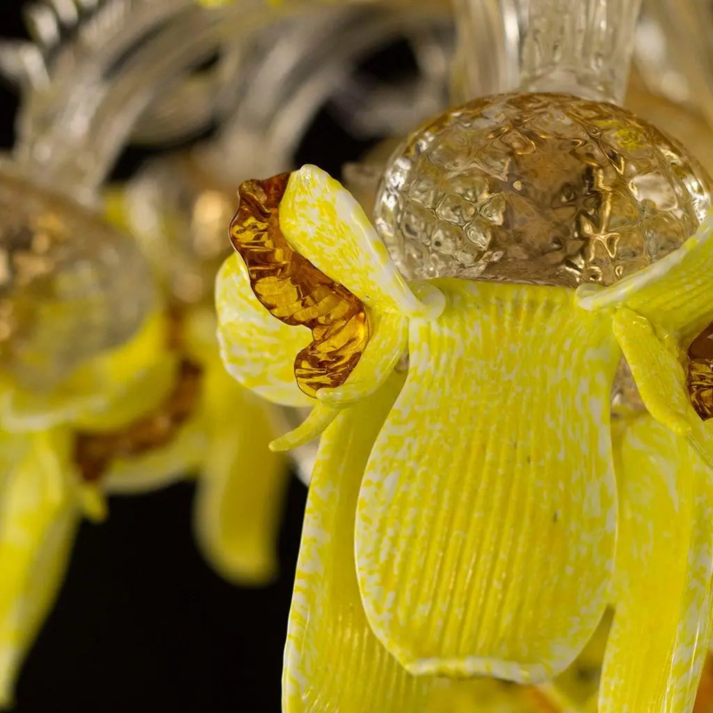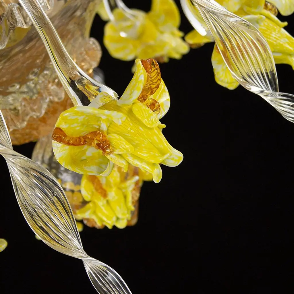 Artistic chandelier 8 arms clear, amber, yellow Murano glass with upper flowers and leaves Iris garden by MultiformeOriginal and innovative artistic glass chandeliers Iris garden. A collection inspired from the flowers. Iris garden is a lighting work that stands out thanks to its originality, but that doesn’t renounce to the elegance typical of the blown glass chandeliers.It is a collection that exalts the polychrome Murano glass decorations, that covers the entire architecture. The collection is characterized by polychrome glass iris of various sizes, flawlessly handcrafted by our masters glass-worker. The iris characterized also some elements of the structure, such as the cups.This chandelier doesn’t need matching furniture; it can be inserted in every project, thus conferring a joyfulness to the space.It is the perfect collection to characterize with style and originality every project and to create stunning atmospheres for your spaces. The catalogue includes chandeliers and also a floor lamp. Other models are available on demand.We are direct manufactuters, based near Venice-Italy and specialized in custom decorative lighting for Interior designers, so we will be glad to give you our best support for your projects in custom or bespoke lighting.The totally handcrafted execution involves dimensional tolerances in the order of +/-5% with respect to the indicated measurements. Some shapes, decorations and colour shades may be subject to slight variations.The colours shown on the screen have different renditions from the real ones, for safety reasons you can request colour samples to be sent to your address. Where required by the model, ceiling rosette and ornamental spare parts will be supplied.This chandelier comes directly from our Murano factory in Italy. Custom clearance taxes and VAT are not included".