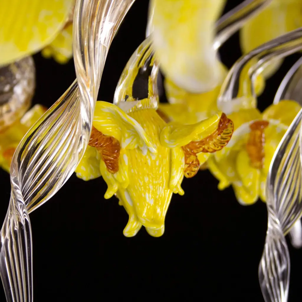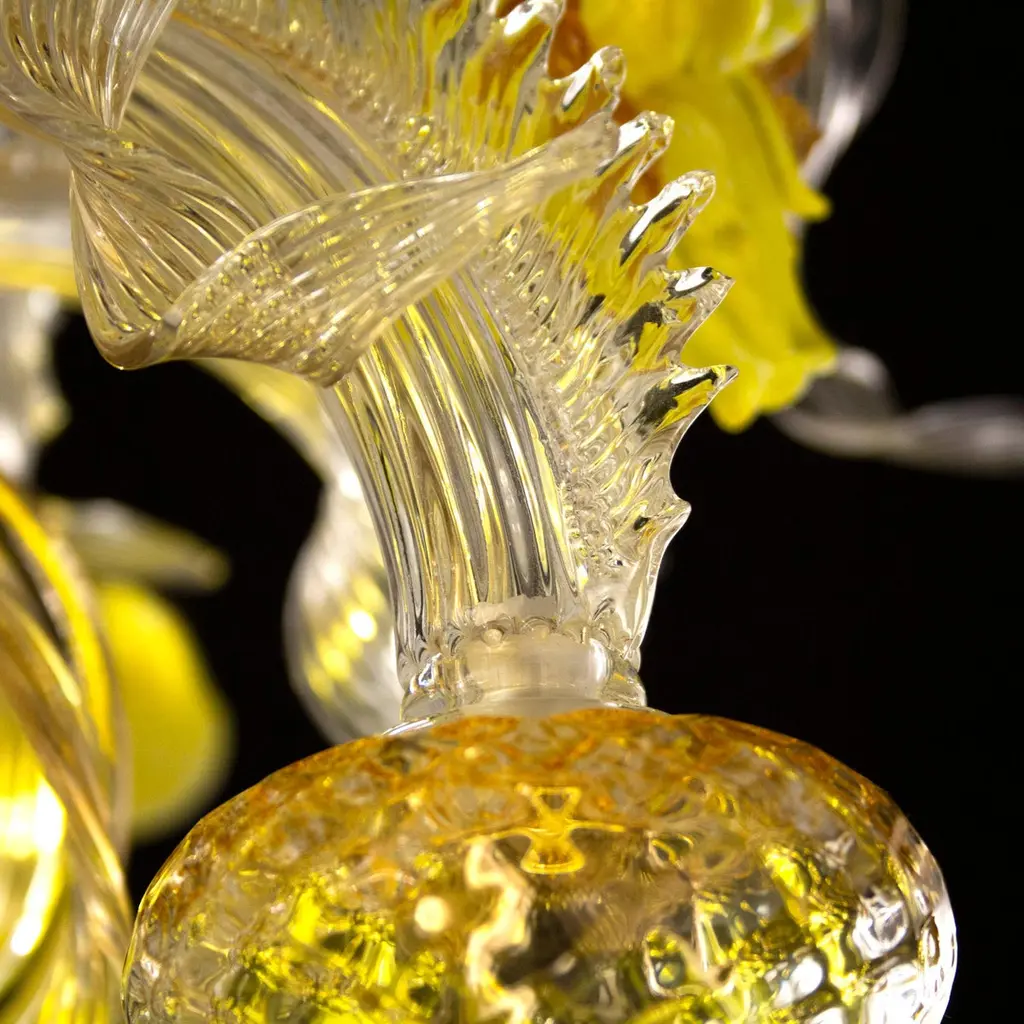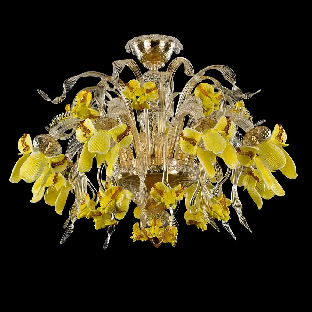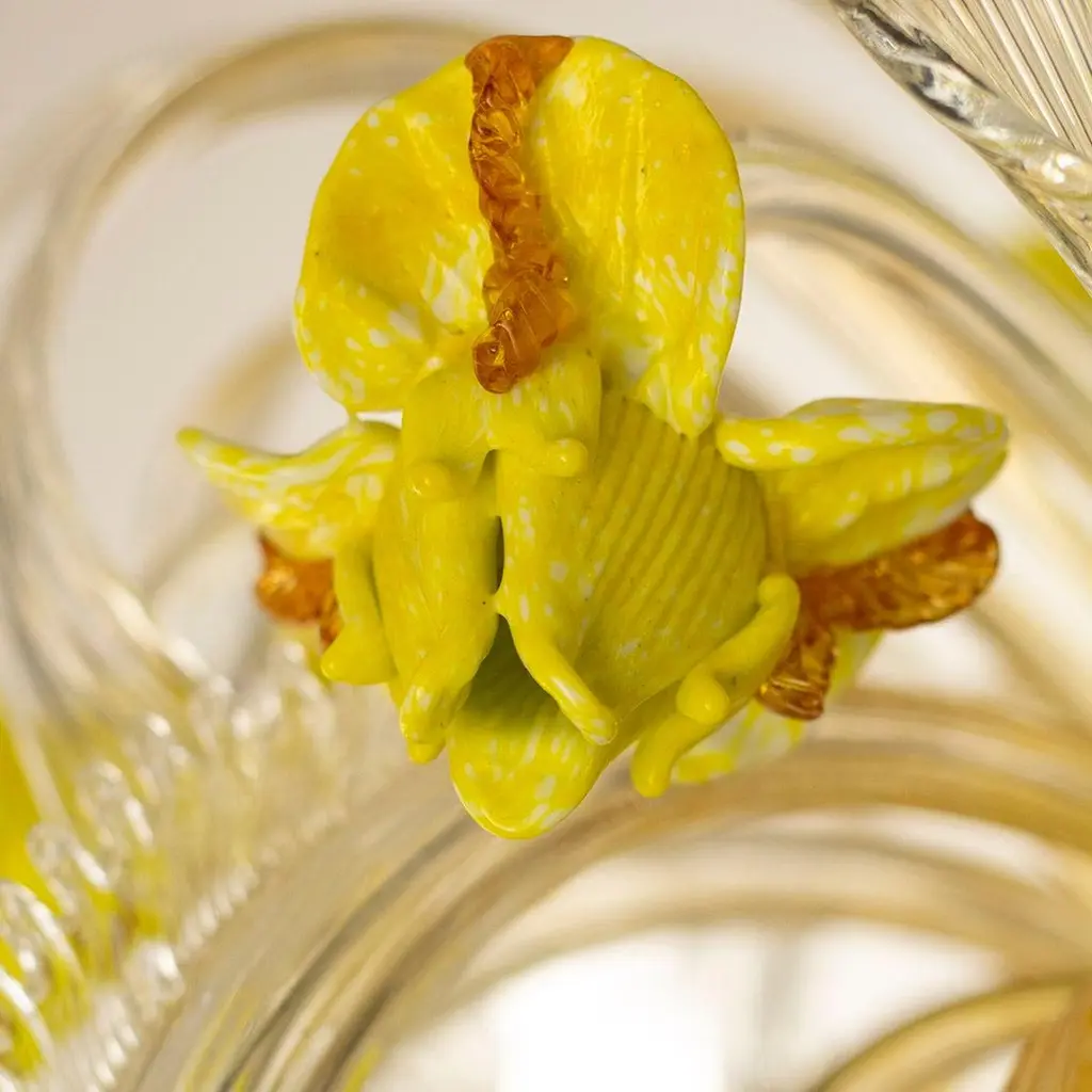 Artistic chandelier 8 arms clear, amber, yellow Murano glass with upper flowers and leaves Iris garden by MultiformeOriginal and innovative artistic glass chandeliers Iris garden. A collection inspired from the flowers. Iris garden is a lighting work that stands out thanks to its originality, but that doesn’t renounce to the elegance typical of the blown glass chandeliers.It is a collection that exalts the polychrome Murano glass decorations, that covers the entire architecture. The collection is characterized by polychrome glass iris of various sizes, flawlessly handcrafted by our masters glass-worker. The iris characterized also some elements of the structure, such as the cups.This chandelier doesn’t need matching furniture; it can be inserted in every project, thus conferring a joyfulness to the space.It is the perfect collection to characterize with style and originality every project and to create stunning atmospheres for your spaces. The catalogue includes chandeliers and also a floor lamp. Other models are available on demand.We are direct manufactuters, based near Venice-Italy and specialized in custom decorative lighting for Interior designers, so we will be glad to give you our best support for your projects in custom or bespoke lighting.The totally handcrafted execution involves dimensional tolerances in the order of +/-5% with respect to the indicated measurements. Some shapes, decorations and colour shades may be subject to slight variations.The colours shown on the screen have different renditions from the real ones, for safety reasons you can request colour samples to be sent to your address. Where required by the model, ceiling rosette and ornamental spare parts will be supplied.This chandelier comes directly from our Murano factory in Italy. Custom clearance taxes and VAT are not included".