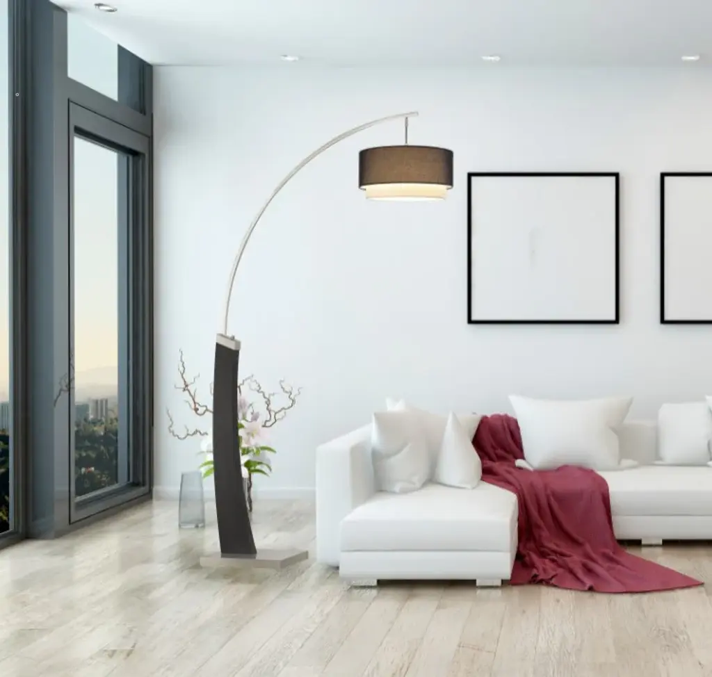 "Katerina" is an excellent match for modern decors and shows off its beauty of premium double shade designs. Industrial/Hollywood allure throughout your space. The square arched curved design adds soft note to your decors. Standing almost 7 feet(81"), the fixture has statuesque appearance and draws your attention. This double shade LED floor lamp direct the light wherever you need it and creates just the right atmosphere with convenient, energy efficient LED dimmer switch. "Katerina" provides ample lighting suitable for reading, writing or creating a spotlight in the setting, behind the couch, corner light or center piece lighting for your living room. This LED lamp features 15W (1800 lumen) true 360-degree view dimmable LED bulb(included) exclusively with Artiva arch lamp. Beautiful steel and black wood finish with Hollywood-inspired adjustable premium white double drum shade. Smart outlet compatible. Beautiful heavy duty square base.