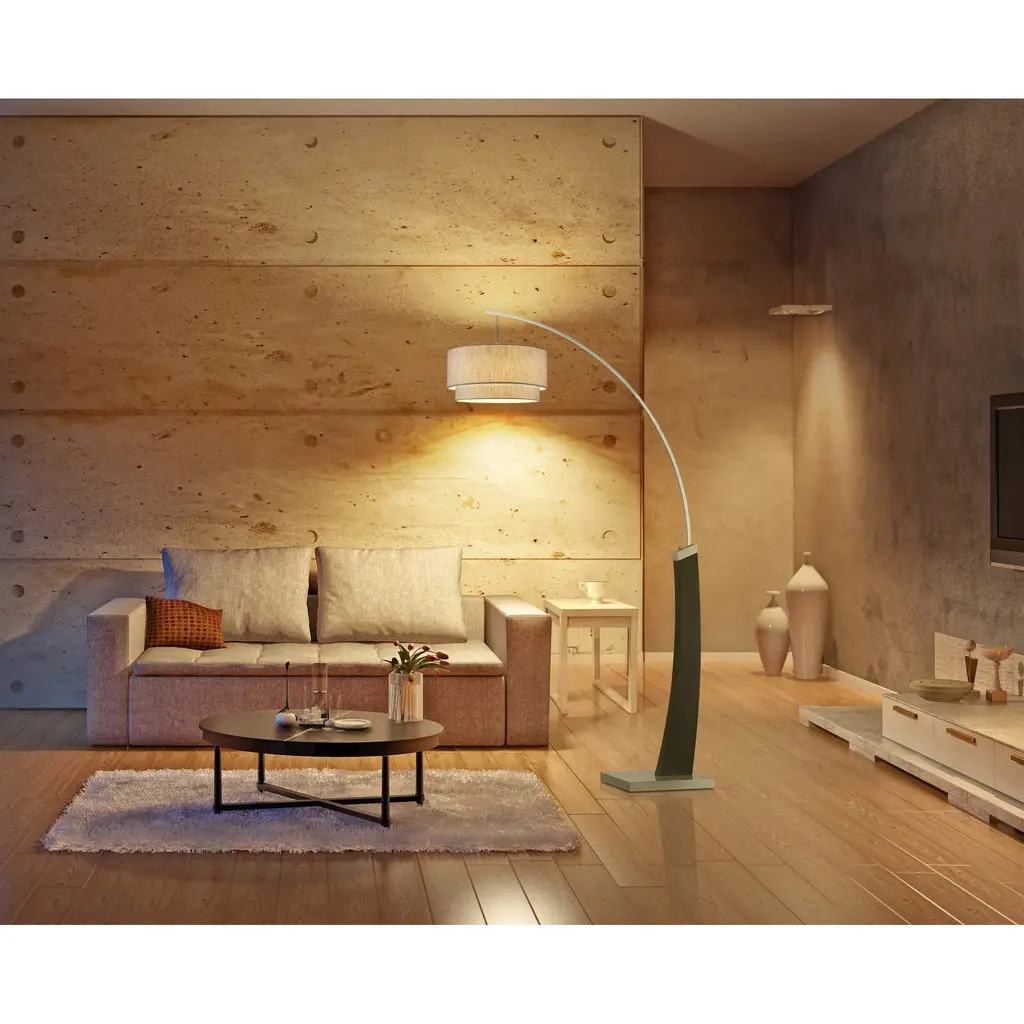 "Katerina" is an excellent match for modern decors and shows off its beauty of premium double shade designs. Industrial/Hollywood allure throughout your space. The square arched curved design adds soft note to your decors. Standing almost 7 feet(81"), the fixture has statuesque appearance and draws your attention. This double shade LED floor lamp direct the light wherever you need it and creates just the right atmosphere with convenient, energy efficient LED dimmer switch. "Katerina" provides ample lighting suitable for reading, writing or creating a spotlight in the setting, behind the couch, corner light or center piece lighting for your living room. This LED lamp features 15W (1800 lumen) true 360-degree view dimmable LED bulb(included) exclusively with Artiva arch lamp. Beautiful steel and black wood finish with Hollywood-inspired adjustable premium Tan double drum shade. Smart outlet compatible. Beautiful heavy duty square base. Most energy efficient and super bright LED(3000k), 1800 lumens used only 15W of electricity. Compare to regular 150W lamp this lamp will save you over $21 electricity per year base on 6 hrs. per day usage and 11 cents per kilowatts Exclusive dimmable LED true 360-degree view 15W (1800Lumen) LED bulb included. rated over 25, 000 hrs. Measurement: 81"H X 48"D X 16.5"W. Featuring exclusive LED Full dimmer switch. Modern steel and black wood finish base with large premium Tan double shade design (16.5"Dia x6+2" H) Beautiful heavy duty square steel base.(15.75"x12"x2"H)