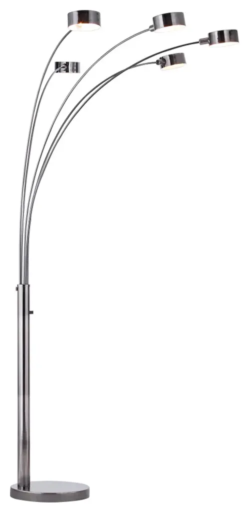 Light up your living room, bedroom or office with this sleek and modern LED 5-Arched Brushed Steel Floor lamp from Artiva USA. A perfect addition to any rooms with modern or contemporary decors. The Micah Pro LED Floor Lamp hold super bright LED lights (5000K , Daylight) with dimming function. The curved design adds a soft note to your decor. Standing over 7 feet, the fixture has a statuesque appearance that draws attention. This Artiva USA exclusive design LED floor lamp allows you to direct the light wherever you need it and provide ample lighting for reading, writing or create a spotlight in the setting behind the couch, in the corner or in the center of your living room. 300W Equivalent ,5-Arched Super Bright LED Floor lamp uses only 35W Energy. The most powerful/brightest LED lamp yet.5 Artiva USA exclusive 7W each (over 4000 Lumen) True 360 Degree view LED bulbs, 5000K ,Daylight , reducing Eye Strain(LED-G9-7TDM-50) included with Dimming function.Adjustable Ach (left or right only) and adjustable shade (360 degrees)Heavy Duty and in beautiful Brushed Black Steel finish.US Patented Design. US Patent# US D753, 867 S