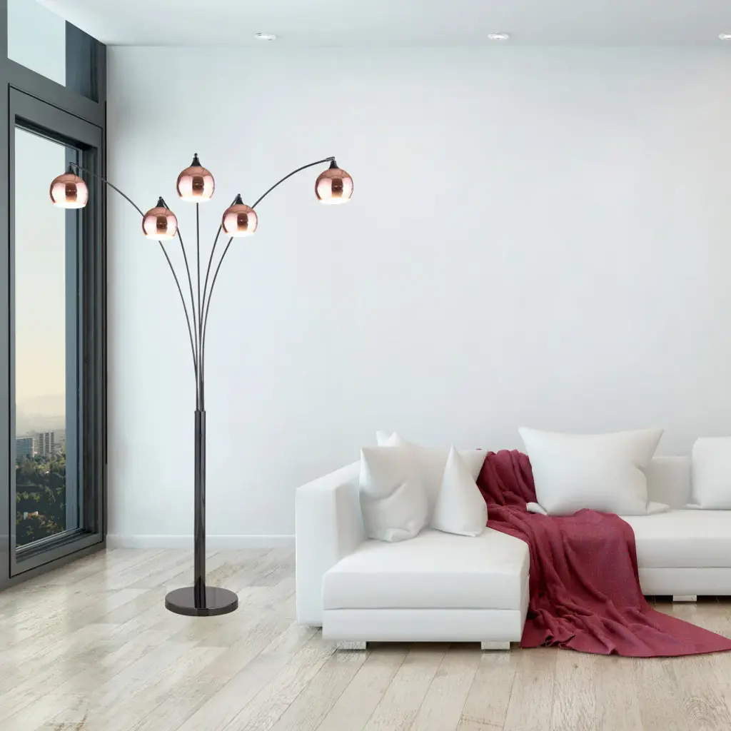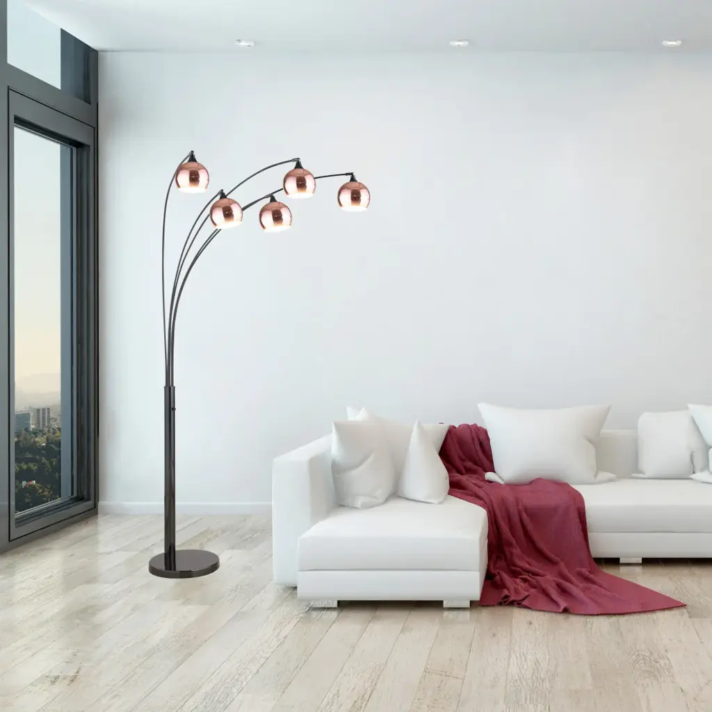 Light up your living room, bedroom or office with this sleek and modern "Amore" 86" Two-tone Rose Copper & Jet Black/Gun Metal, 5-Arch LED Floor lamp with dimmer switch from Artiva USA"Amore" is a perfect addition to any room with modern or contemporary decor. The "Amore" floor lamp holds Super bright LED(5000 Lumens, 375W replacement) and warm LED lights(3000K) with dimming function. The curved design adds a soft note to your decor. Standing over 7 feet, the fixture has a statuesque appearance and draw attention. The Artiva exclusive LED floor lamp allows you to direct the light wherever you need it and provide ample lighting for reading, writing, or creating a spot light in the setting behind the couch, in the corner or in the center of your living room. Heavy weighted base grants perfect balance and prevents the lamp from tipping. Smart outlet Compatible. Artiva USA exclusive, five true 360-Degree view LED bulb included. US Patended Design. US Patent #: US D822,878 SExclusive Five 8W (5000 Lumens , 375W replacement)True 360-Degree view LED Bulb includedCompare to 375W lamp, this artiva LED lamp uses only 40W of electricity and will save you over $80 every year off of your electric bill (based on 6-hours per day usage and 11 cents per kilowatt)Adjustable arches (left or right). and adjustable modern shade(180 Degree)Beautiful Two-tone Rose Copper & Jet Black/Black Chrome/Gun Metal) finishFeaturing exclusive LED dimmer switch.US Patented Design. US Patent# US D822, 878 S