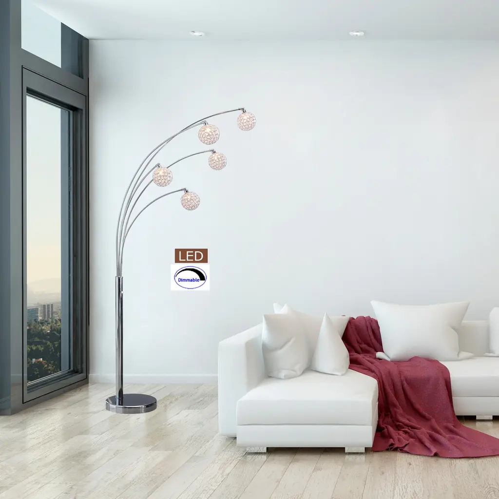 Bring a touch of modern elegance to any room with the Artiva USA Quan 84" 5-Arch Crystal Ball LED Floor Lamp with Dimmer. The handcrafted crystal balls reflect the LED light beautifully, creating a warm and inviting ambiance. This lamp features an adjustable arch, allowing you to direct light where you need it, and a full-range dimmer for maximum convenience. With its energy-efficient LED bulbs and chrome finish, this lamp is the perfect addition to your home decor.Features: