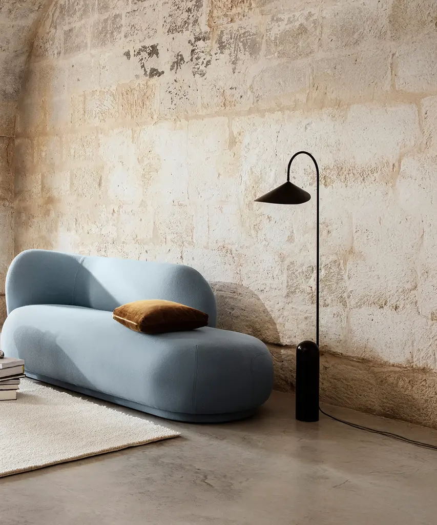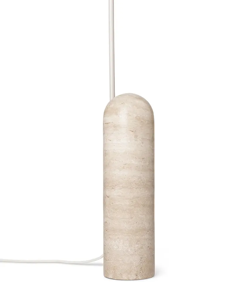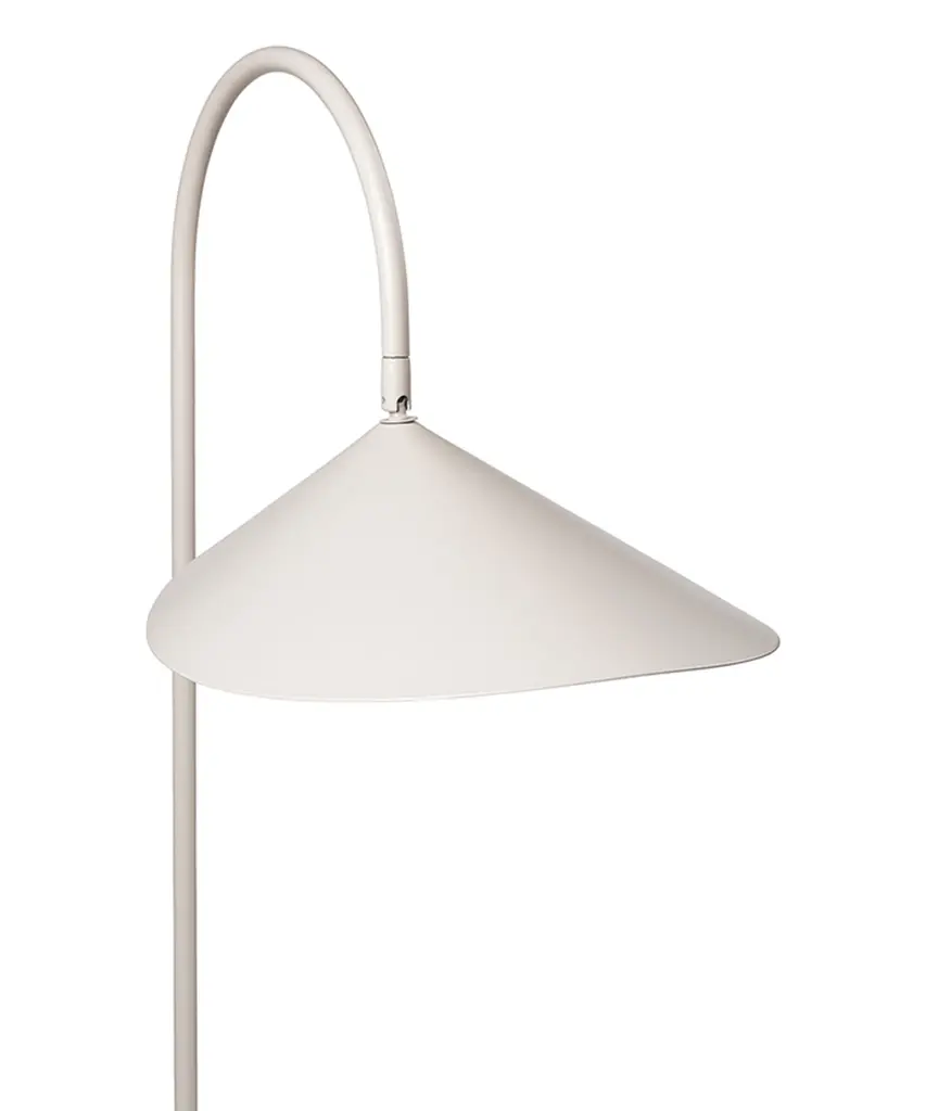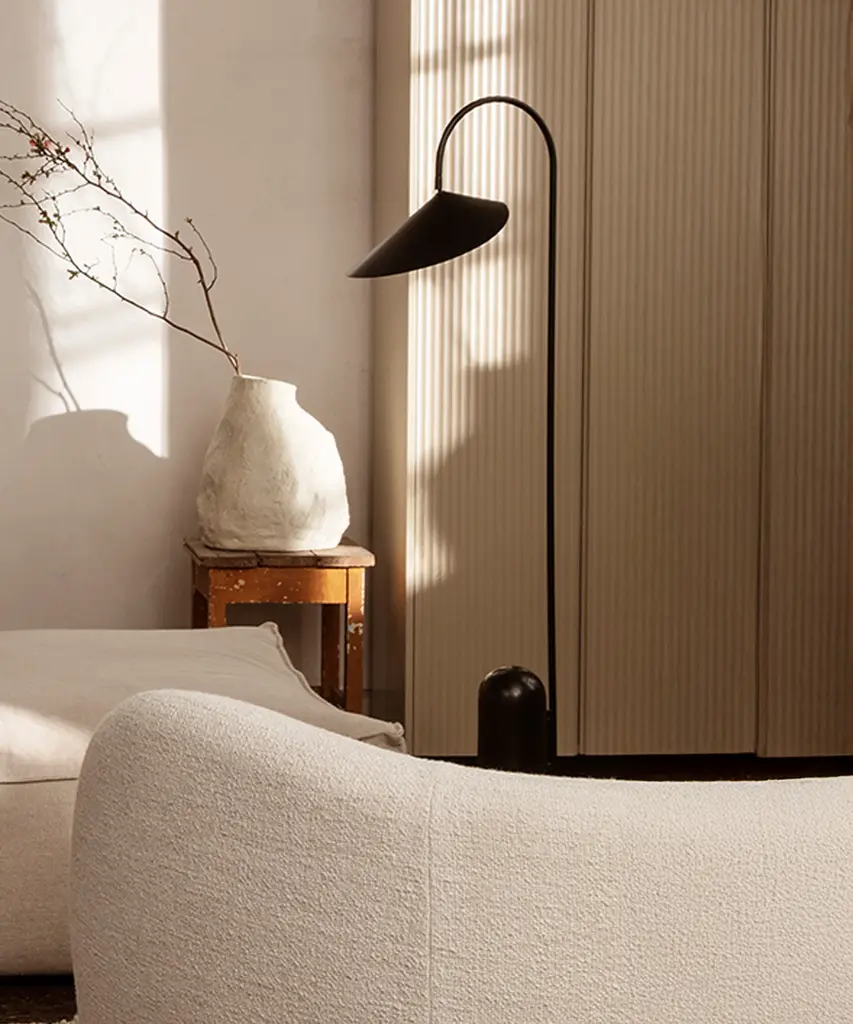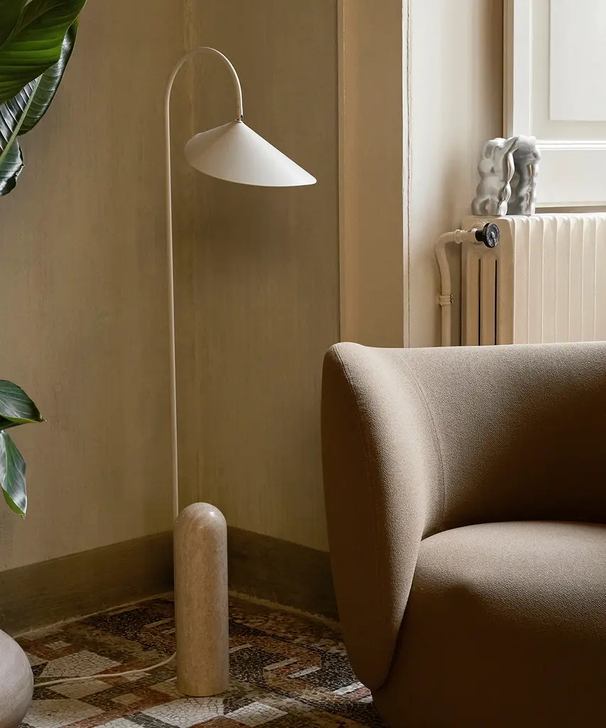 The Arum Floor Lamp is characterized by the black solid marble base combined with the organically shaped lampshade. Achieving the perfect balance in the off-centre structure of the lamp, the black marble foot counterweighs the gentle way the lampshade is suspended from the curved metal arch in a leaf-like manner. With the matte, off-white inside of the shade, the lamp provides a soft, evenly distributed light, and the lampshade can be adjusted to ensure optimal light conditions in all situations. Designed and produced by the Copenhagen-based studio Ferm Living.