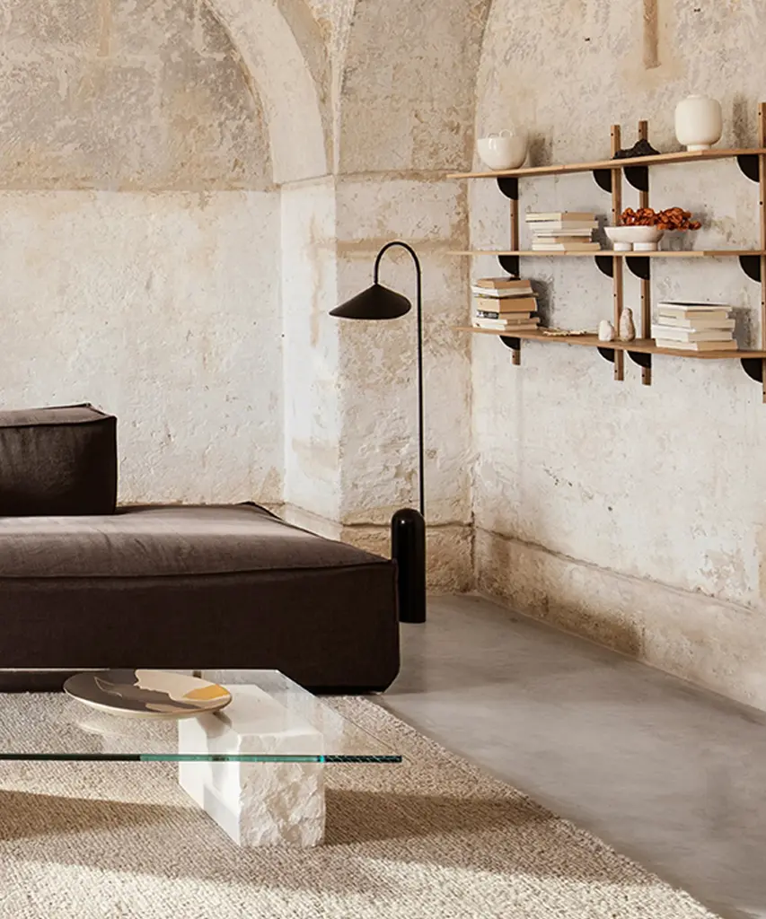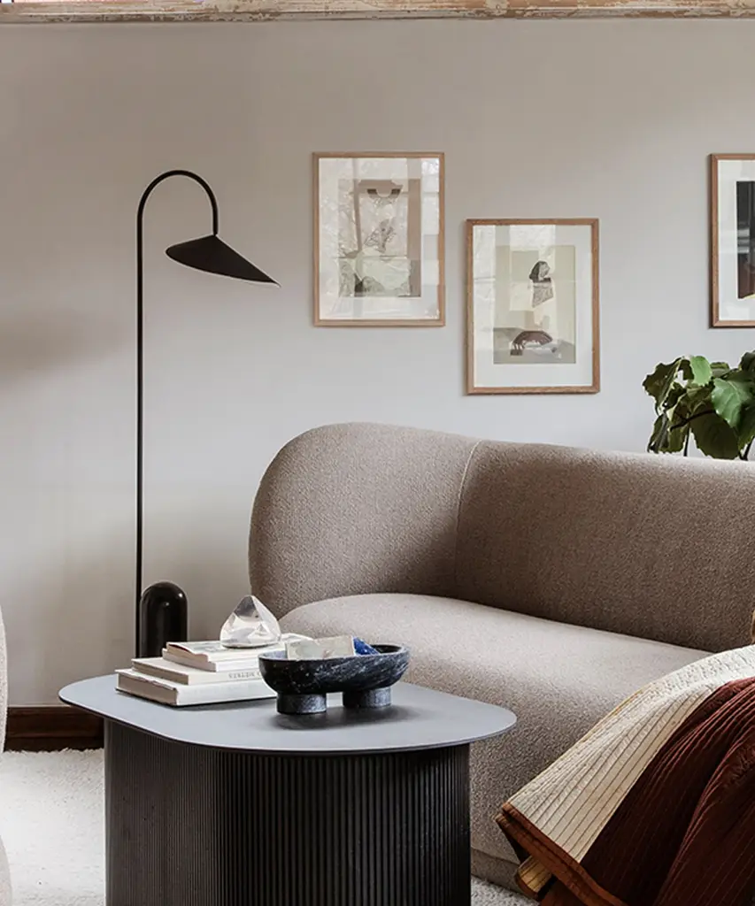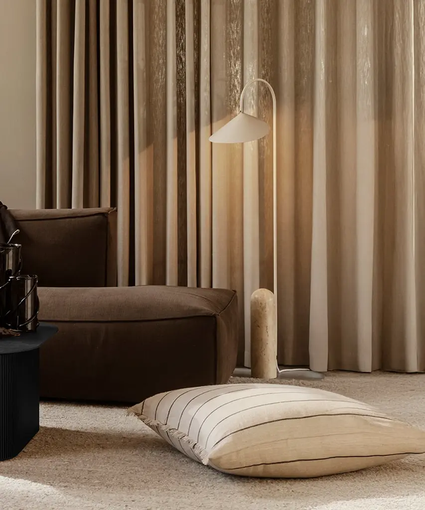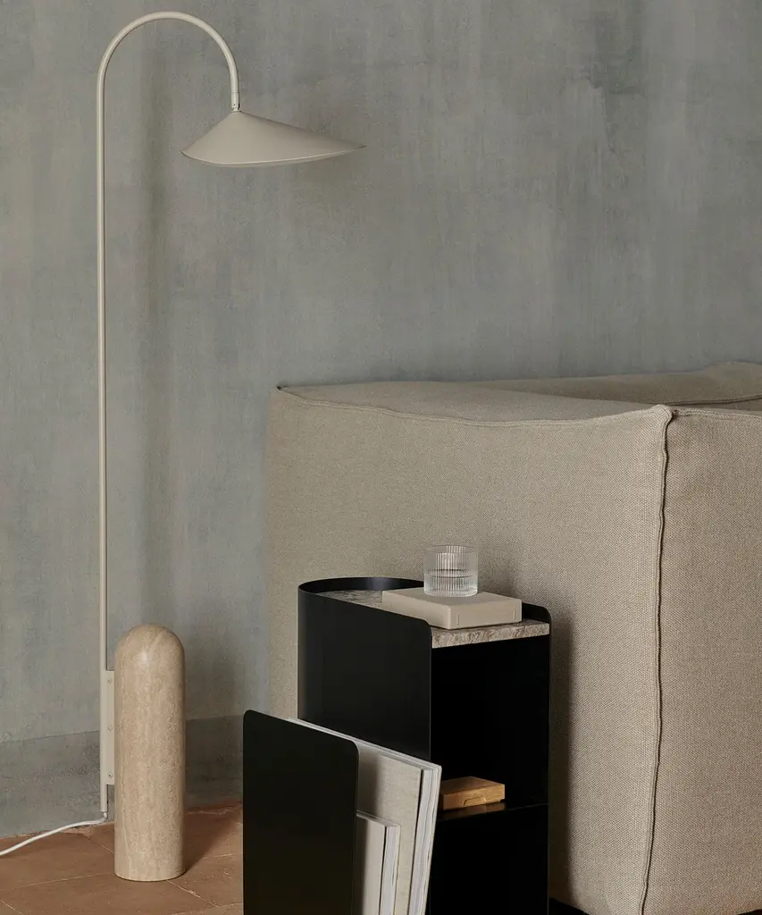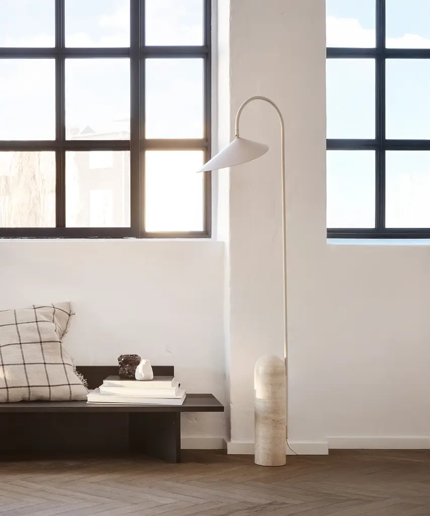 The Arum Floor Lamp is characterized by the black solid marble base combined with the organically shaped lampshade. Achieving the perfect balance in the off-centre structure of the lamp, the black marble foot counterweighs the gentle way the lampshade is suspended from the curved metal arch in a leaf-like manner. With the matte, off-white inside of the shade, the lamp provides a soft, evenly distributed light, and the lampshade can be adjusted to ensure optimal light conditions in all situations. Designed and produced by the Copenhagen-based studio Ferm Living.