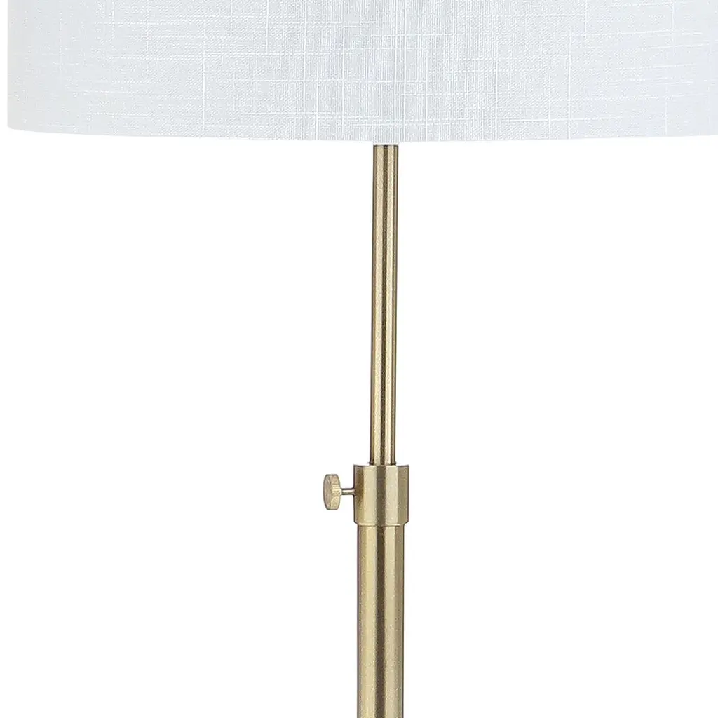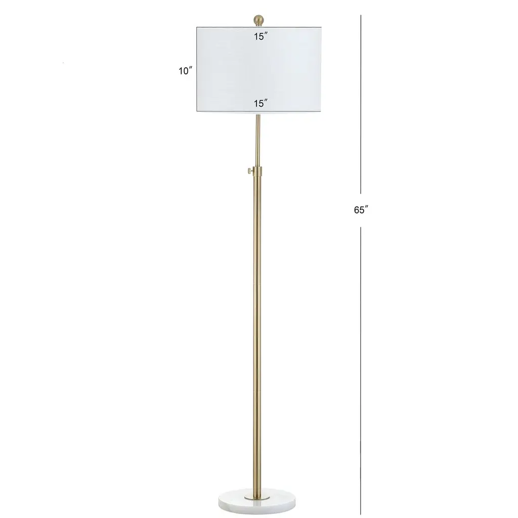 Ideal for tight corners, cozy nooks, or minimalist spaces, this foor lamp can adjust in height from 52 to 66 inches. Its slender body rests on a white marble base. A linen drum shade and a silk-wrapped cord add to its elegance.