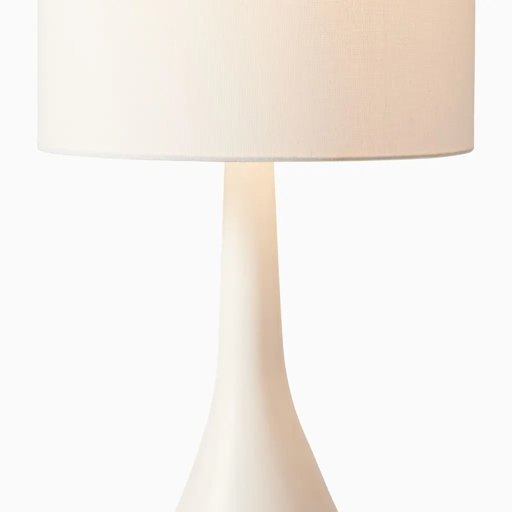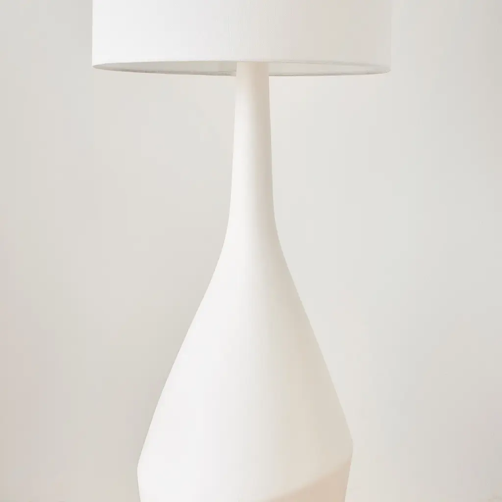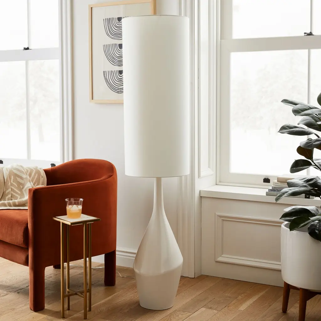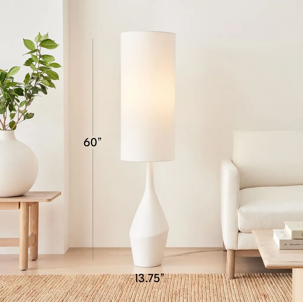 Pure, smooth white coloring adds a special touch to the fluid form of our Asymmetry Ceramic Floor Lamp. Topped with a linen shade, it offers diffused light next to a bed or in a reading nook.