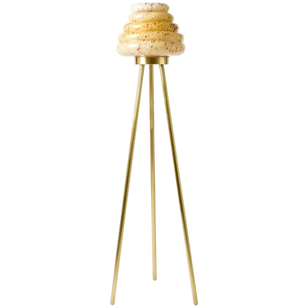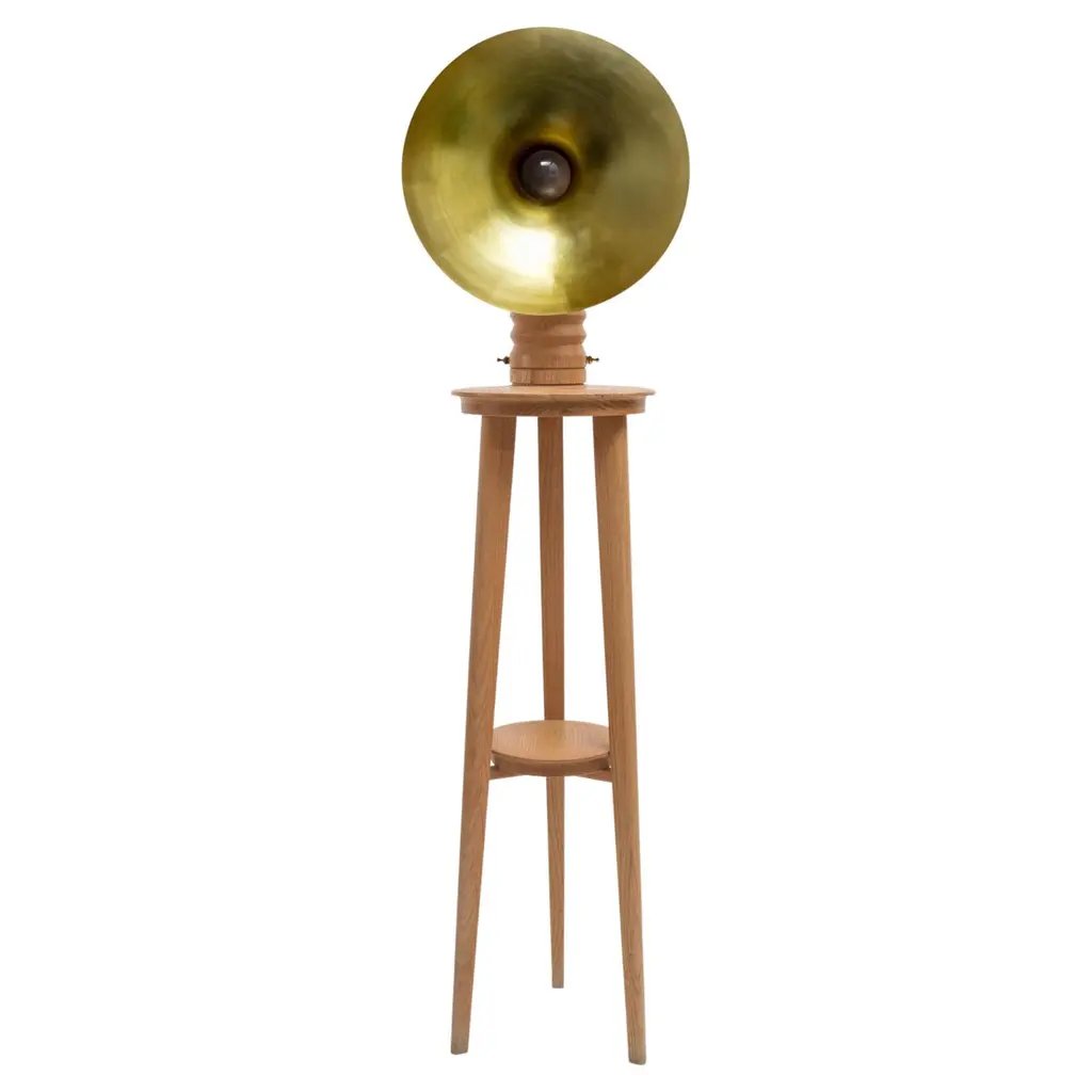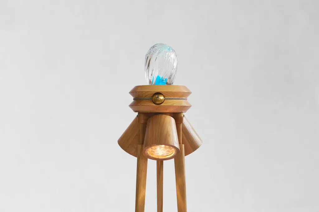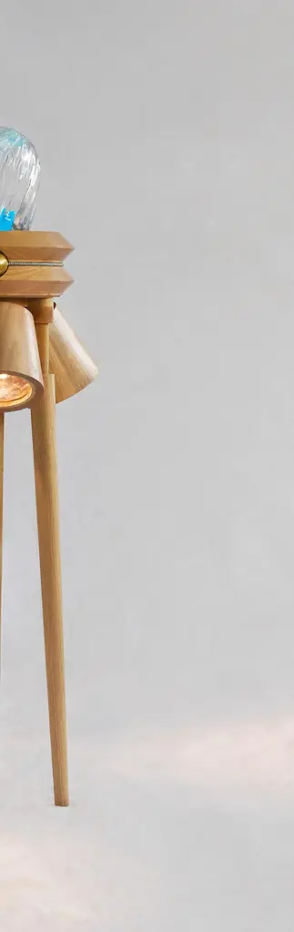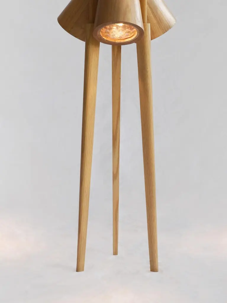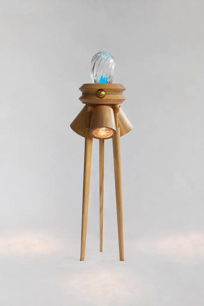 Atmosfera floor lamp by AcoocooroDimensions: Ø 49 x H 150 cm.Materials: Solid oak wood tripod lamp, blown-glass screens (4), and resin diffuser.All our lamps can be wired according to each country. If sold to the USA it will be wired for the USA for instance.Space is crucial in any ritual, as it is in the process of taking participants in a state of meditation and mystical predisposition. The pedestal, made in solid oak, and its crystal, are designed to modify and reconfigure the space that houses this object. Lights from the pedestal illuminate the floor, add texture, and create new shadows.On the other hand, the crystal is meant to reflect the viscous and almost organicnature of glass in its original, malleable state. Light coming from the crystal is encapsulated, distorted, and projected in the shape of water-like reflections. Atmósfera is a mysterious and peculiar object, an artifact capable of transforming space.Founded in 2017 by Martín Diego Salido-Orcillo and Antonio Mendoza Bravo, ACOOCOORO is a furniture, lighting and artifacts studio, a lab, focused on aesthetic and historic research, on objects' narrative and emotional relation with individuals and space.Every object, every piece, more than a product in a collection, is the result of exploration and experimentation through materials, processes and artisanal work. These elements fill every one of them with history, stories and memories: those of the individuals that conceive and create them, and those of the people that live their lives through and with them.Silent Design, finally, is a guiding principle in ACOOCOORO's practice, whenever the collaboration with artisan groups is involved, with a complex yet clear goal: the establishment of non-extractive, cooperative, self-sufficient relations, where craftsmanship, economic benefit, authorship, property, and narrative are reclaimed by and rebalanaced in favor of the artisans themselves, and notthe designers.