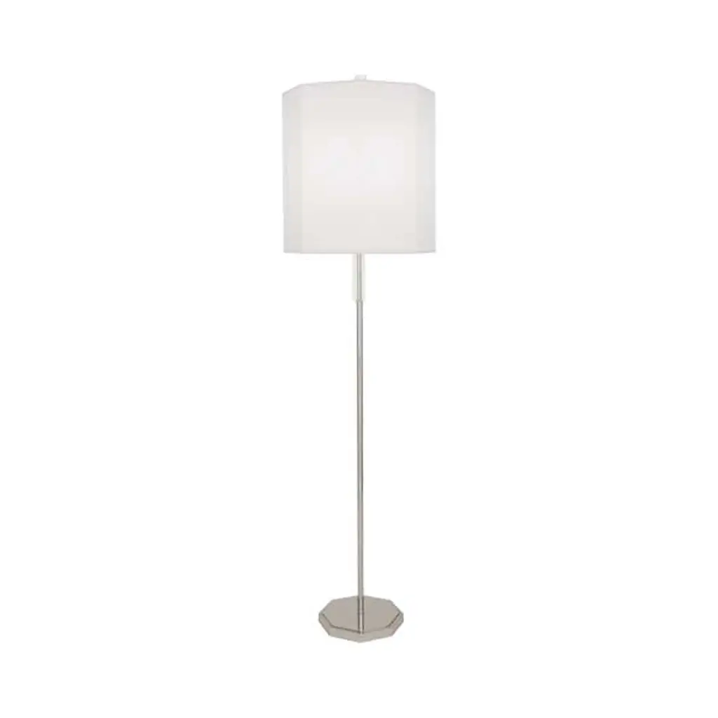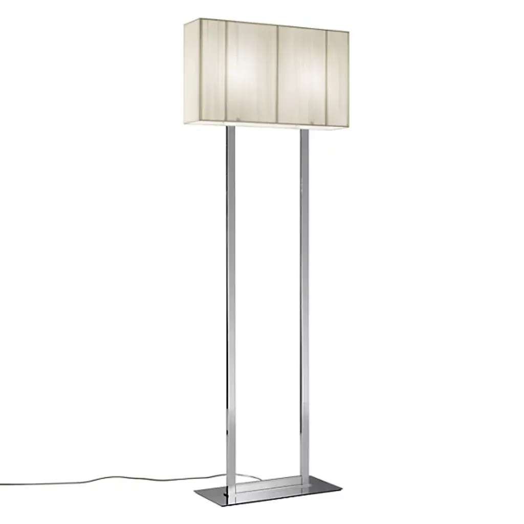 This elegant floor lamp celebrates the endlessly mesmerizing potential of reflective surfaces and well-diffused light. A dramatically slender cylindrical element stemming from a rectangular base form the luminous structure in polished nickel-finished brass, emphasized by the light radiating from above and filtered by the parallelepiped-shaped diffuser dressed in a beige fabric with a pleated design.