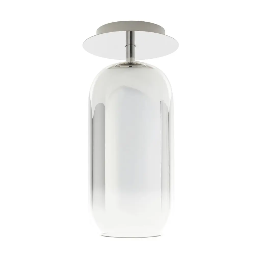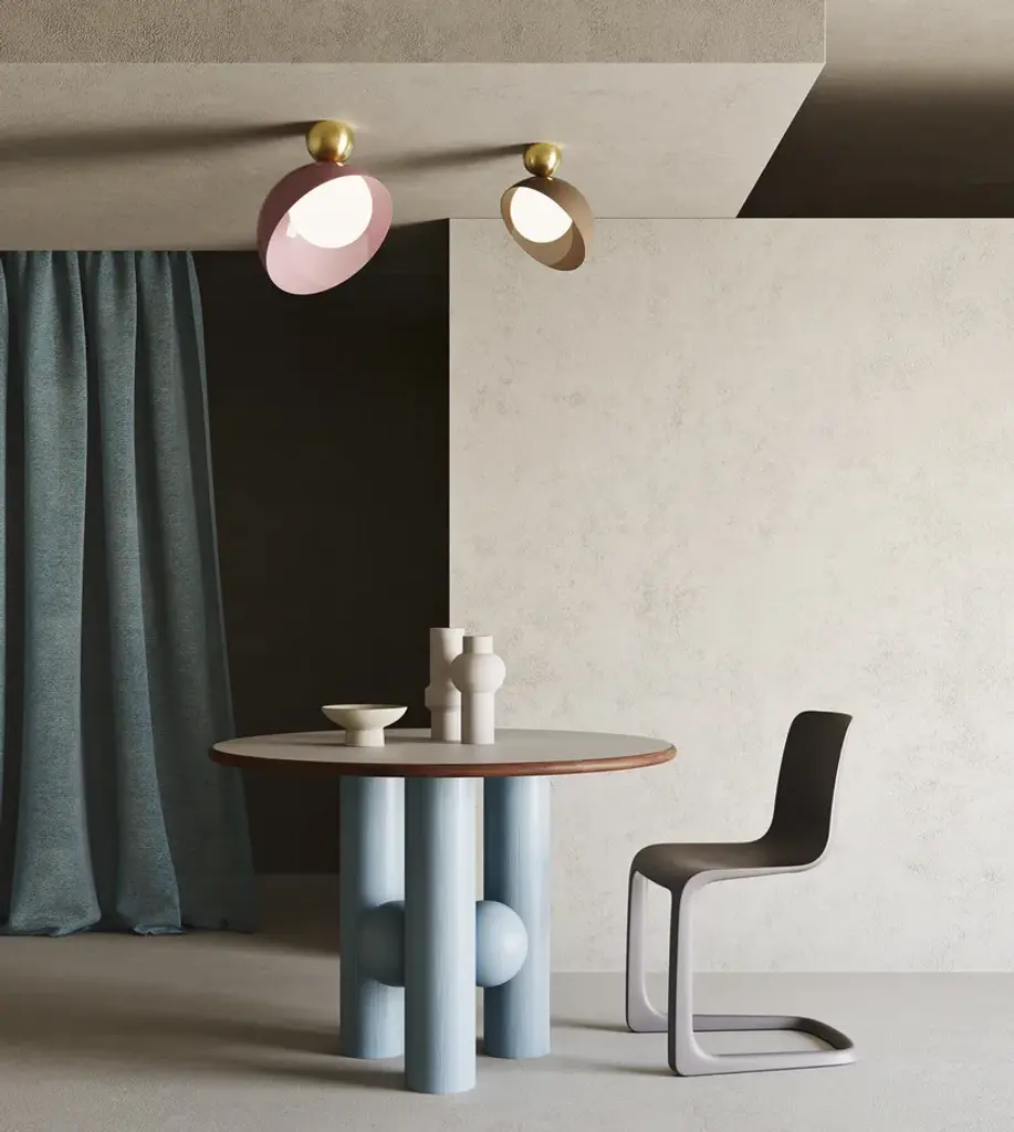 Aurora is a ceiling lamp with structure and decorative parts in metal available in Ancient White, Yellow Sunrise, Baby Blue, Baby Pink and Cappuccino. Middle sphere with brushed light gold finish. Diffuser in white glass.Led bulbs: 1x6w - E14TRIACAurora is an eclectic and colorful collection. A multifaceted soul with a seductive retro allure, Its naming alludes to the light that takes over the sky just before sunrise, and the finishes recall the colors of early Italian industry. Available in every versions, it includes floor, table, ceiling, suspension and wall solutions.