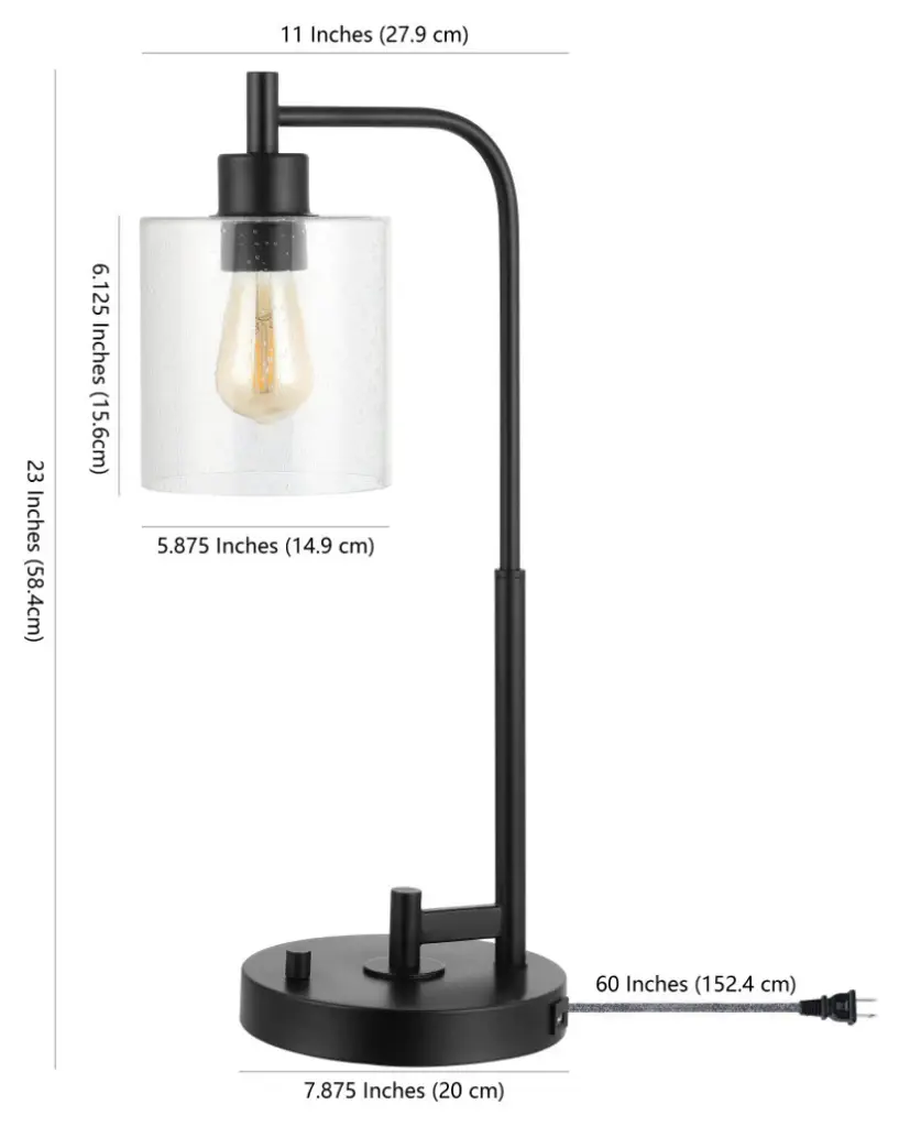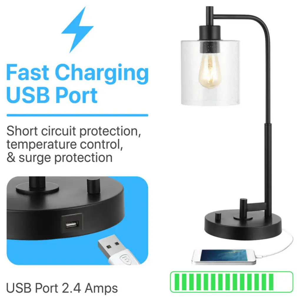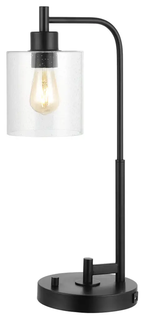 Upgrade your living room, home office, or bedroom with our farmhouse-inspired modern black lamp. A clear seeded glass shade highlights the Edison-style LED bulb, while the handy USB outlet keeps cord clutter at bay. These minimalist desk, bedside, or console lamps are the perfect solution for a vacation home or hospitality project.-This lamp''s transitional style is perfect for modern and rustic interiors, especially guest rooms and resort rentals-Quality touches include a seeded glass shade, USB charging port, and an elegant silk-wrapped cord-Takes 1 bulb and compatible with 9W LED or 40W TYPE "A" or 13W CFL-Eco-friendly 4W LED bulb included-Fixture can be dimmable with a dimmable bulb (not included) and Electric Low Voltage dimmer (sold separately)-Color Temperature: 2700K-CRI: 80-Color: Black with clear shade-Body Material: Iron/Glass-Base Material: Iron -Includes: One (1) lamp-Assembly Required-Lamp: 23 inches high x 11 inches wide x 7.88 inches deep-Shade: 6.13 inches high x 5.88 inches wide x 5.88 inches deepYou see a lamp.We see a decorative work of art.A perfectly curved shade casts a dramatic shadow on a floor. A silk cord you never want to hide. Compatible with LED lightbulbs: as easy on the environment as they are on the eyes. The JONATHAN Y Lighting collection considers every detail from impeccably sourced materials to designer styling. And our prices are so attractive, we''ve transformed a functional necessity into a fashion accessory.JONATHAN Y Lighting - a fashion revolution in home decor.