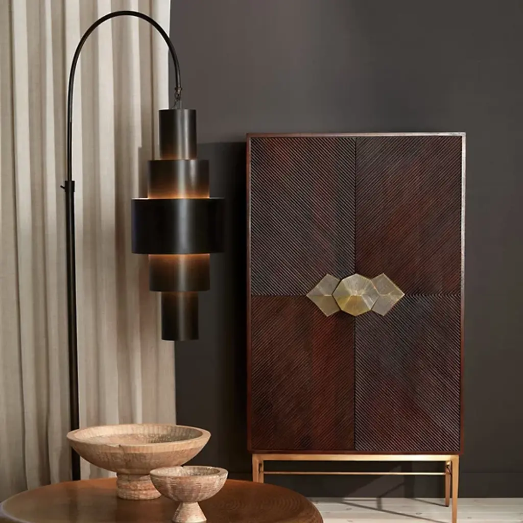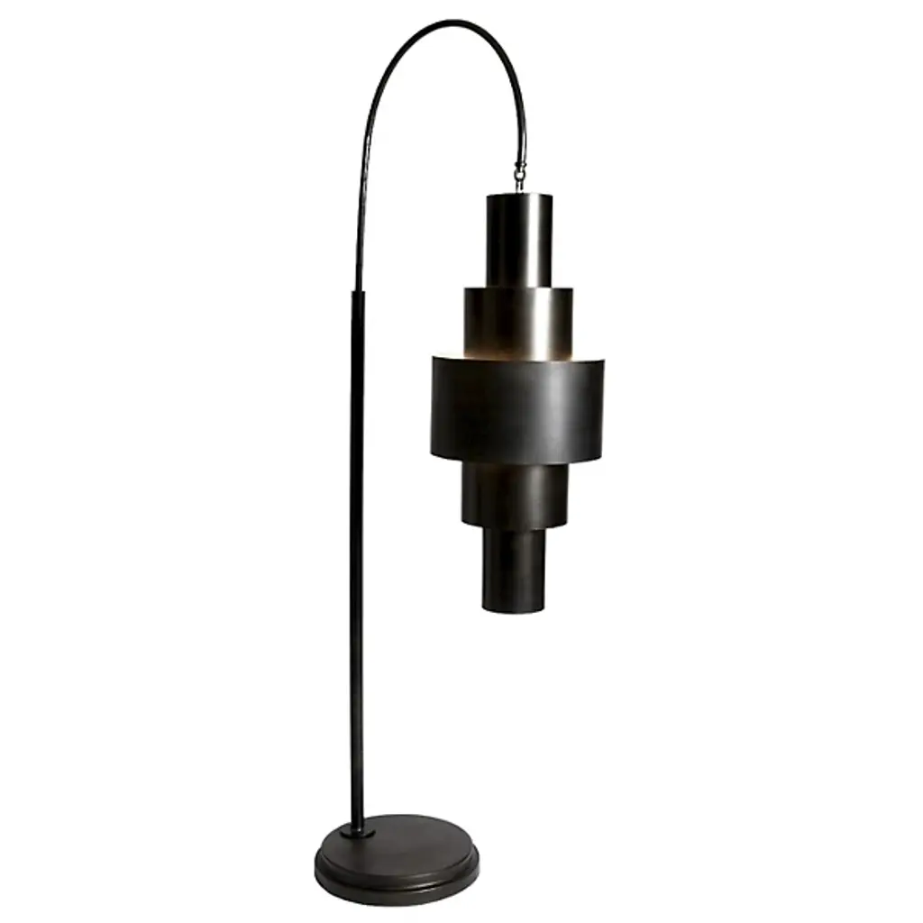 A titanic tower of steely geometrics, the Global Views Babylon Floor Lamp nests a series of progressively sized concentric shades to form a substantial three foot shade of Bronzed steel. A heavily weighted iron base ensures it stays upright. Can be turned on and off with a tap of the foot via the cord-affixed floor switch.